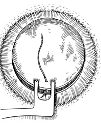 The diameter of the tissue to be removed is determined by the size and position of the pathology and the diameter of the recipient cornea. If possible, all thinned, necrotic, or infected tissue should be removed. The donor button should be at least 5.5 mm in diameter, and it is preferable that it be placed at least 2 mm from the limbus. The donor should be 0.5 to 1.0 mm larger than the recipient bed, to facilitate wound closure. Oversized grafts (>0.5 mm) tend to result in steeper postoperative corneas and therefore can be used to reduce hyperopia in aphakia. Similarly, they could lead to myopia in phakic eyes and should be avoided. Therefore, in infants, with a corneal diameter of 10 to 11 mm, typically a 7-mm donor is placed in a 6.5-mm bed. In a microphthalmic eye, particularly those with axial lengths of 13 mm or less, graft–host disparity of 1.5 mm appears to improve results.16 The donor corneoscleral rim is removed from the storage medium and placed in a trephine block, endothelial side up. The cornea is centered in the well, and excess medium is removed. A hollow shaft trephine is carefully centered and aligned vertically over the tissue and then firmly punched through the donor button (Fig. 2). A variety of trephines are available, some of which attempt to ensure centering and verticality of the cut, and some of which place four cardinal marks on the donor epithelium (e.g., Hanna trephine; Barron donor trephine). A drop of storage medium is placed on the endothelial surface, and the cornea is covered. The donor rim should be cultured.