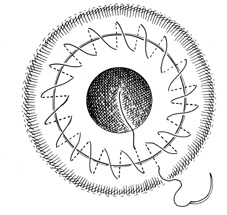 Alignment of the second suture at the 6 o'clock position is crucial to ensure proper distribution of the tissue in the bed. Donor and recipient marks created with the trephines can facilitate suture placement. Anterior iris adhesions can be severed once four to eight cardinal sutures are in place. This is often best done with the chamber filled with a viscoelastic material, particularly in phakic eyes. The peripheral angle is swept with an iris spatula, avoiding contact with the posterior surface of the donor cornea. In some cases sharp dissection is required. If viscoelastic material is not sufficient to maintain the chamber, then additional interrupted sutures or part of the continuous suture is placed before the dissection is performed. A continuous suture is preferable in most cases because it facilitates rapid wound closure, induces less postoperative inflammation, and is easier to remove when the wound is healed. Interrupted sutures are used when there is localized corneal vascularization (present in some quadrants and not in others) or there is some other reason to expect uneven wound healing. In these cases interrupted sutures can be removed from healed areas while leaving sutures in unhealed areas. Continuous sutures are indicated when symmetric healing is expected, the cornea is totally avascular, or all quadrants are vascularized to a similar extent. Interrupted sutures can also be used when the child is old enough to cooperate with selective suture removal at the slit-lamp to reduce astigmatism. The continuous suture consists of 16 to 24 bites placed in the posterior quarter of the cornea (Fig. 8). The two suture ends are tied on the graft surface with one triple throw, and the interrupted sutures are removed. The chamber is filled with saline solution. The continuous suture is tightened with non-toothed forceps, and the wound is checked for leakage, using topical application of fluorescein dye if necessary. If leakage is present, the running suture is tightened further. The knot then is completed with two additional single throws. If leakage is detected at this point, superficial interrupted sutures are placed as necessary. The scleral fixation ring is removed and subconjunctival injections of antibiotic (e.g., gentamicin, 20 mg) and long-acting corticosteroid (e.g., methylprednisolone acetate, 40 mg) are given. Antibiotic ointment is placed in the eye, which is then covered with a pressure patch and shield. If necessary, elbow restraints are placed on young children to avoid eye manipulation. The following technique can be helpful in eyes with severe posterior pressure: When excising the host cornea a small hinge is left uncut (on the left for right-handed surgeons). The cornea is lifted temporarily to lyse synechiae and inject viscoelastic, and then reattached with one 7-0 silk suture on the side opposite the hinge. A thick layer of viscoelastic is placed on top of the recipient's cornea, and the donor cornea is placed on top and sutured into place with two 9-0 nylon cardinals. The recipient cornea is then cut free and slid out from underneath. |