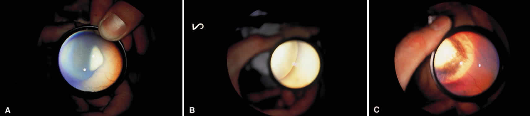 It is important to be able to determine the response to treatment using the methods previously outlined. For eyes that have been enucleated, the prosthesis should be removed on each subsequent visit and the anophthalmic socket inspected and palpated for recurrent orbital tumor. For eyes not enucleated, careful indirect ophthalmoscopic examination is the best method of determining the status of the remaining or residual tumors and for recognizing radiation retinopathy or other complications. Ultrasonography can be used to document the decrease in tumor size after treatment. |