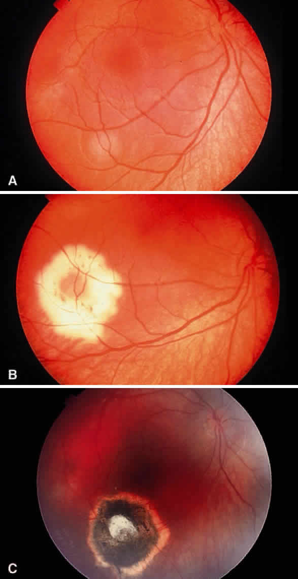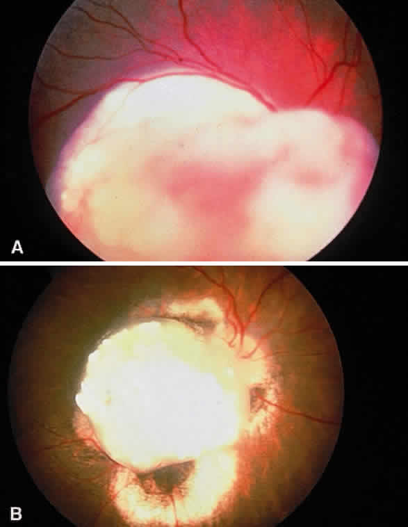 experience. If the tumor is unilateral and large, enucleation or chemoreduction plus adjuvant focal treatments are options. If the histopathologic findings in the enucleated eye show no sign of optic nerve or choroidal invasion, then systemic chemotherapy is not provided. However, if the histopathologic study reveals choroidal or optic nerve invasion,53,54 suggesting a poor prognosis, then chemotherapy is advised. If there is extensive invasion of the optic nerve or orbital involvement, then supplementary chemotherapy and irradiation to the anophthalmic socket are indicated.55 Usually, 3500 to 4000 cGy in divided doses over a 4 to 6 weeks is adequate. In bilateral cases in which attempts are being made to save the remaining eye, combined treatment may be more complex. After chemoreduction, external beam radiotherapy, or scleral plaque irradiation, a tumor may remain viable, as suggested by persistent dilated retinal blood vessels feeding the tumor or enlarging mass. Supplementary photocoagulation, thermotherapy, or repeat plaque radiotherapy may be necessary in such cases to eradicate the residual viable tumor. If the tumor recurs as a small growth near the ora serrata, supplementary transcleral thermotherapy or freeze-thaw cryotherapy may be used. If such a peripheral recurrence is greater than 3 mm in elevation and has vitreous seeding, a supplementary radioactive plaque may be applied. |