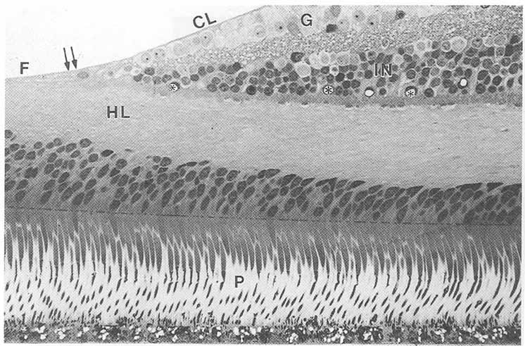 The choroid is a highly vascularized and pigmented tissue that is the posterior extension of the ciliary body (Fig. 18). It extends from the ora serrata anteriorly to the optic nerve posteriorly. The choroid is light to dark brown in color and sponge-like in appearance. The venous channels within this structure occupy an extensive amount of space in a fashion similar to that of erectile tissue. The thickness of the choroid is difficult to estimate postmortem because of the extreme vascular nature of this tissue. Estimates range from 0.2 to 0.3 mm at the posterior pole to 0.1 to 0.15 mm at the ora serrata.68 The thickness of the choroid diminishes with age because of a decrease in the size and number of the venous channels in its stroma. External to the choroid lies the sclera. There is a potential space between these two structures. Posteriorly, this is called the suprachoroidal space, whereas anteriorly it is termed the supraciliary space. The vessels and nerves supplying the choroid traverse this space after penetrating the sclera. This potential space extends from the scleral spur anteriorly to the optic nerve head posteriorly. Delicate collagen lamellae stretch from the sclera into the external surface of the choroid. Internally, the choroid is closely adherent to the retinal pigment epithelium and the intervening Bruch's membrane. It is for this reason that retinal detachments occur between the neural retinal layers and the pigment epithelium instead of between the pigment epithelium and the choroid. The blood supply to the choroid is extensive, being provided by the long posterior ciliary arteries, the short posterior ciliary arteries, and the anterior ciliary arteries. As previously noted, there is an anterior ciliary arterial circle. Posteriorly, the short posterior ciliary arteries anastomose to form the circle of Zinn in the sclera at the edge of the optic disc. The posterior ciliary arteries have short arterioles that form the choriocapillaris.114 The venous drainage of the choroid is via the vortex veins. Where the various venous channels converge to form the vortex veins just internal to the sclera, there is a venous dilatation or ampulla measuring 1.5 to 2 mm in diameter. The choroid consists of four layers: (1) suprachoroid; (2) stroma; (3) choriocapillaris; and (4) Bruch's membrane. The outermost layer of the choroid, the suprachoroid, is situated between the inner layer of the pigmented sclera (lamina fusca) and the large vessel layer of the choroidal stroma. The 30-μm-thick layer contains long, ribbon-like fibers of collagen that form a loose branching network that connects the sclera to the choroids. Numerous melanocytes are present in this layer in addition to ganglion cells, nerve plexuses, elastic fibers, and fibroblasts. Similar cells extend throughout the choroidal stroma. The extensive number of melanocytes in the choroid and suprachoroid gives these structures their dark brown coloration. The stroma of the choroid contains a large meshwork of branching small arteries and arterioles as well as venous channels. This stromal layer can be divided into two portions. Closest to the suprachoroidal layer is a layer (of Haller) of large arteries and veins. The arteries are unfenestrated, and the veins in this layer coalesce to form the vortex veins. Internal to Haller's layer at the center of the choroid is a layer (of Sattler) of highly intertwined, unfenestrated, medium-sized vessels in a loose collagen stroma. The small arteries are between 40 and 90 μm in diameter, and the arterioles are approximately 20 to 40 μm in diameter. The venous channels in the stroma measure from 100 to 300 μm in diameter for the larger veins to 10 to 40 μm in diameter for the smaller veins.116 Short posterior ciliary nerves supply most of the vascular structures within the choroid. The choriocapillaris forms the capillary bed of the choroid. Posteriorly, the meshwork of vessels in this layer measures 3 to 18 μm in cross-section, whereas at the equator these vessels measure 6 to 36 μm in cross-section by 36 to 400 μm in length. In the macular region, the diameter of these vessels is approximately 20 μm, and elsewhere it ranges from 18 to 50 μm. These capillaries are considerably wider in cross-section than capillaries elsewhere in the body. They have fenestrations measuring 80 nm in diameter. The most interior portion of the choroid is Bruch's membrane, which was formed in part by the basement membrane of the pigmented epithelium and by the thicker basement membrane of the choriocapillaris. This membrane extends from the optic disc margin to the ora serrata, becoming continuous with a similar structure in the ciliary body. The membrane is 2 to 4 μm in thickness near the optic disc and thins to 1 to 2 μm peripherally. Bruch's membrane thickens with aging.117 Bruch's membrane consists of five layers: the basement membrane of the pigment epithelium, the inner collagenous zone, the elastic layer, the outer collagenous zone, and the basement membrane of the choriocapillaris.118–120 The basement membrane of the pigment epithelium is 0.3 μm in thickness and consists of fine filaments that join the cell membrane of the pigment epithelium to the adjacent collagen. A space measuring 100 nm separates this membrane from the cell membrane of the pigment epithelium. The inner collagenous zone is 1.5-μm thick. It consists of interwoven collagen fibrils that are oriented in all directions and are firmly adherent to the basement membrane of the pigment epithelium. These collagen fibrils are 60 nm in diameter and have a periodicity of 64 nm. The elastic layer is 0.8-μm thick and is composed of multiple rod-like elastic fibers and some collagen fibers. Irregular spaces exist between the elastic fibers that form a woven pattern that is two to four fibers in thickness. Peripherally, the elastic layer is less continuous. The outer collagenous zone is 0.7 μm in thickness and is similar in structu