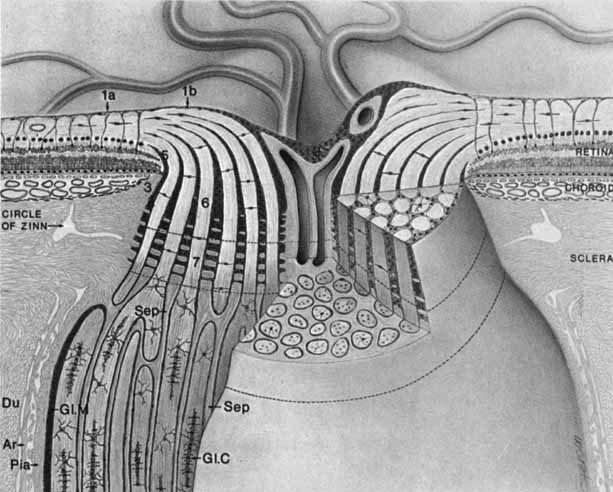 and the prelaminar, laminar, and retrolaminar portions of the nerve. The intraocular portion lies within the limits of the posterior sclera and measures approximately 1 mm in length (Fig. 23). The internal surface is in contact with the vitreous. When viewed on the retina, it is termed the optic disc. It is somewhat larger in males than in females and in blacks than in whites.155 The surface area of the disc averages 2.34 ± 0.47 mm2.156,157 In one study, age and gender had no significant effect on disc size; however, myopic discs were found to be larger than hypermetropic discs.156 The disc is pale pink and may be round or slightly oval. Its horizontal diameter averages 1.75 ± 0.19 mm, whereas its vertical diameter averages 1.8 ± 0.21 mm.1 The center of the optic disc is approximately 4 mm medial and 0.8 to 1 mm superior to the foveola.158 It is 27 mm from the nasal limbus and 31 mm from the temporal limbus. The optic nerve pierces the sclera approximately 3 mm medial and 1 mm inferior to the posterior pole of the globe. Ophthalmoscopically, the appearance of the optic disc depends on several factors, including the termination of the surrounding retinal and choroidal layers, the degree at which the nerve enters the scleral canal and leaves the globe, the size of the globe, the shape, size, and orientation of the scleral canal, the branching of the vessels at its surface, the glial tissue within the nerve head, the size of the optic cup, and the number of nerve fibers present in the nerve head.159 Generally, the termination of the retinal layers occurs in an oblique fashion so that the inner layers end before the outer layers. This shelving of the retinal layers is more prominent nasally than temporally, where the termination of the retinal layers may be vertical. When the retinal pigment epithelium and retina terminate before reaching the optic disc, a choroid crescent is visible. If the retinal and choroidal layers terminate before reaching the optic disc, a scleral crescent is visible. When the pigment epithelium is folded or prominent, a pigment crescent may be visible. The optic disc may appear tilted if the optic nerve exits at a more oblique angle, as is often the case in axial myopia. The central portion of the optic disc contains the central retinal artery and vein.160–162 The central retinal artery is a branch of the ophthalmic artery. The central retinal vein drains into both the cavernous sinus and the superior ophthalmic vein. In general, these vessels are present on the nasal side of the optic cup and disc and divide on the surface of the disc into superior and inferior branches, which further divide into nasal and temporal branches. Rarely, the branching of these vessels may appear to occur within the substance of the nerve so that only their branches and not their main trunks are visible within the optic cup. The nerve head is surrounded by a mound of unmyelinated nerve axons as they converge into the optic disc. This convergence of the nerve fiber layer is called the papilla and varies in height depending on the amount of glial tissue present, the branching of the retinal vessels, and the size of the optic disc and cup.163 Although nerves in the intraocular portion are unmyelinated, a thin layer of astrocytes associated peripherally with processes from Müller cells is present (the inner limiting membrane of Elschnig). Centrally, this membrane may be quite thickened, forming what is called the central meniscus of Kuhnt. At the disc margin, the retinal axons bend sharply over the edge of the disc. The axons in this area become segregated as bundles by neuroglial cells oriented at right angles to the fascicles. The astrocytes present in the disc form a three-dimensional basket-like network.163 Surrounding the nerve and separating it from the retina and choroid is the circular intermediate glial tissue of Kuhnt. The laminar portion of the optic nerve head consists of retinal ganglion cell axons and central retinal vessels that pass through a porous connective tissue region of the posterior sclera, called the lamina cribrosa.164 The lamina cribrosa forms a scaffolding for the optic nerve axons and serves to anchor the axons to each other and to the sides of the optic nerve canal.165–168 The lamina is formed by collagen and elastic tissue from the inner one-third of the sclera. This tissue extends across the optic nerve canal to form a sieve-like membrane through which the optic nerve fascicles pass. Pores are significantly larger in the superior and inferior quadrants than in the nasal and temporal quadrants, and the differences are more pronounced for peripheral regions compared to central regions.168 The anterior portion of the lamina is concave with the concavity facing anteriorly.16,163 The lamina cribrosa terminates posteriorly at the point where the initial septae of the optic nerve are formed by pial tissue. As in the prelaminar portion of the optic nerve, astrocytes surround the axonal bundles, separating them from the connective tissue of the lamina cribrosa and the vessels within the nerve. Glial tissue surrounds the nerve, and outside this glial tissue is a connective tissue layer of Elschnig. Posterior to the lamina cribosa lies the retrolaminal optic nerve, which represents a transition zone from the optic nerve head to the orbital portion of the nerve. The nerve axons in this area become myelinated. Pial septae originating from the posterior surface of the lamina cribrosa surround the nerve fascicles as they leave the lamina. As the nerve leaves the sclera, it becomes surrounded by a connective tissue sheath that externally is continuous with the sclera and represents the dura overlying the arachnoid and pial tissues. The subarachnoid and subdural spaces end blindly at the point where the optic nerve exits the sclera. The scleral canal is usually conical in shape, being narrower internally than externally. However, it may also be cylindrical and, rarely, 