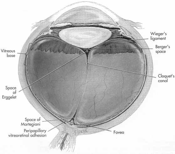 The posterior chamber is an irregular-shaped space containing aqueous fluid. It is bounded anteriorly by the posterior surface of the iris, centrally by the lens capsule and the junction of the lens and iris, and peripherally by the ciliary body and iris. The posterior border of this chamber is the anterior vitreous face. However, it may also be considered the interface of the posterior zonules with the anterior vitreous. The size of the posterior chamber is somewhat dependent on the size of the pupillary aperture and is approximately 65 μL.7 The posterior chamber can be divided into three portions: the posterior chamber proper (pre-zonular compartment) containing aqueous fluid and lying between the posterior surface of the iris and a plane defined by the anterior-most zonules, the zonular portion (canal of Hannover) lying between the anterior and posterior zonules and containing collagen fibrils as well as zonules that obliquely traverse this space, and the retrozonular space of Petit lying between the posterior zonules and the anterior vitreous. |