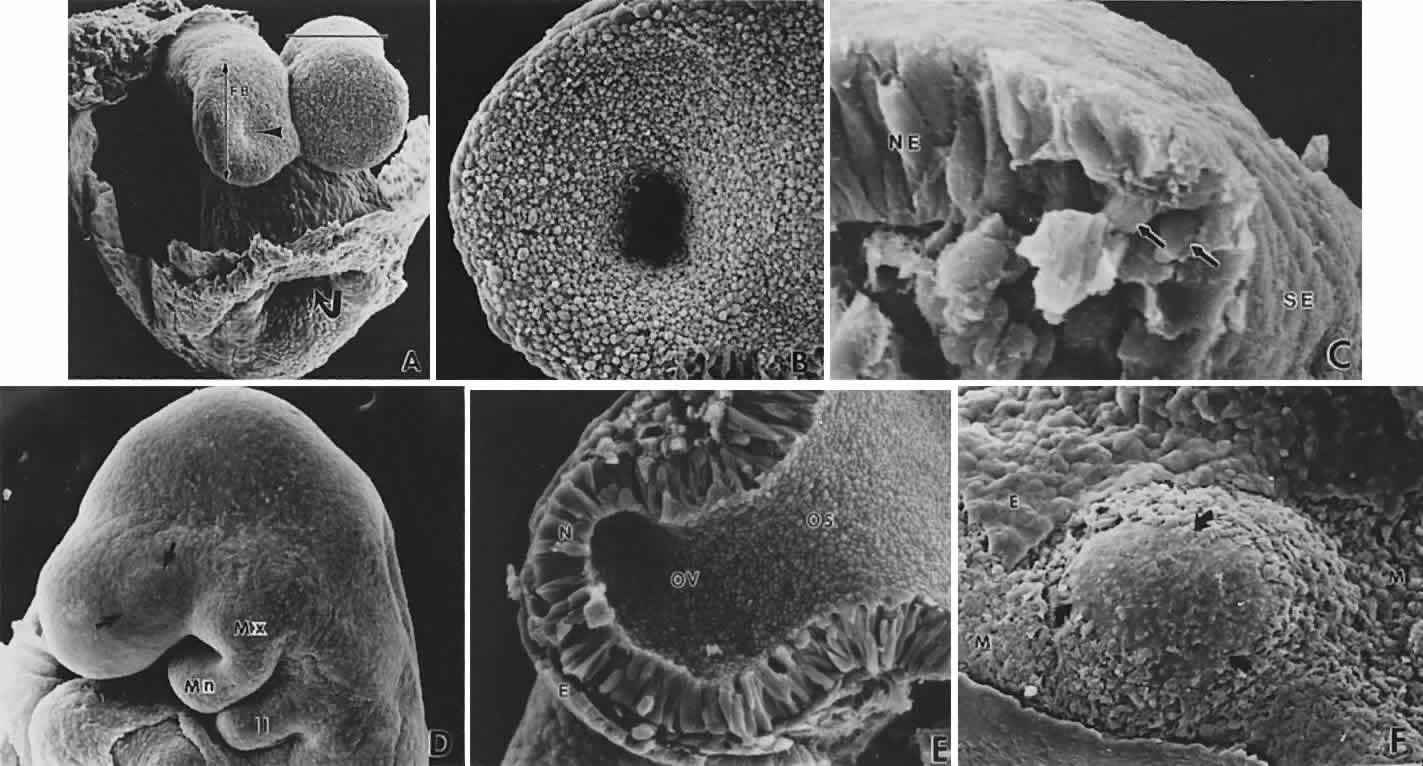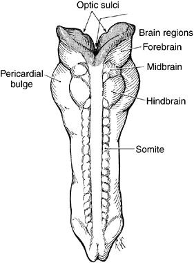 The cranial neural crest contributes most of the connective tissues of the eye and its adnexal structures.14,19,27–41 The hyaluronic acid-rich extracellular matrix influences migration and differentiation of the neural crest cells. This acellular matrix is secreted by the surface epithelium as well as the neural crest cells and forms a space through which crest cells migrate. Fibronectin secreted by the noncrest cells forms the limits of the mesenchymal migration. Interactions between the migrating neural crest and the associated mesoderm appear to be essential for normal crest differentiation. Many congenital malformations of the anterior segment and cornea probably arise from derangements in the axial migration of ocular neural crest. Experimental embryologic studies have shown that the mesoderm actually contributes little to head and neck mesenchyme. The cranial correlates to the paired paraxial somites are called somitomeres. Seven pairs of cranial somitomeres have been identified in the mouse.33,40,42–51 In the eye, the mesoderm contributes only to the striated extraocular muscles and vascular endothelia. To these limited primary mesodermal elements come associated neural crest satellite cells (surrounding the striated muscles) and pericytes (surrounding the vascular endothelium). Circulating blood elements originate from mesoderm. The term mesenchyme broadly refers to any embryonic connective tissue and should not be confused with mesoderm. With respect to the head and neck, most of this connective tissue derives from the cranial neural crest, with the exceptions mentioned. The optic primordium is a thickened zone in the differentiating central nervous system that forms the neural folds of the early embryo. Some of the neuroepithelium composing the optic primordium becomes the future optic cup and stalk; some cells may delaminate to contribute to the neural crest.27 The optic sulcus or groove arises in the primordium at the time when the neural folds are still open in the forebrain (8 to 15 somite pairs, approximately 2 to 3.5 mm) (Figs. 3 and 4A). With enlargement of the sulcus, the optic evaginations and, later, the optic pits appear in the region of the future forebrain (see Fig. 4B). The portion of the evaginations adjacent to the midbrain contacts the mesencephalic neural crest cells, which will form the mesenchymal envelope isolating neural from surface ectoderm (see Fig. 4C).