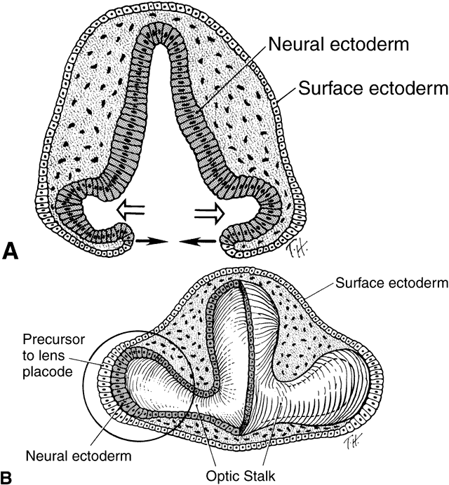 At about the 24th day (2 to 4 mm) with the closure of the neural tube, the optic pits are pushed outward away from the central nervous system and toward the surface ectoderm. The two lateral bulges, caused by the outward extension of the growing optic pits, become pouch-shaped vesicles at about the 25th day of development (20 somite pairs) (Fig. 5; see Fig. 4D and E). The optic vesicles become sheathed with cells of neural crest origin27 that, except for a small region in the center of the bulge, separate them from the surface ectoderm (see Fig. 4E). The future primordium of the retina is present before closure of the neural tube, when the neural ectoderm is still open to the amniotic cavity. The optic stalk is formed by a constriction of the area between the vesicles and the future forebrain. At this time, all cells lining the inner surface of the vesicle's cavity are ciliated, and its outer surface, as well as the inner aspect of the surface ectoderm overlying it, is covered by a thin basal lamina. The next event is invagination of the optic vesicles by differential growth and buckling to form the optic cup (Figs. 6 to 9). The temporal and lower walls move inward against the upper and posterior walls. This process also involves the optic stalk so that the optic (choroid/embryonic/retinal) fissure is formed where the two laterally growing edges of the cup and stalk meet. Mesenchyme (primarily neural crest) penetrates immediately into the cup by filling up the fissure.