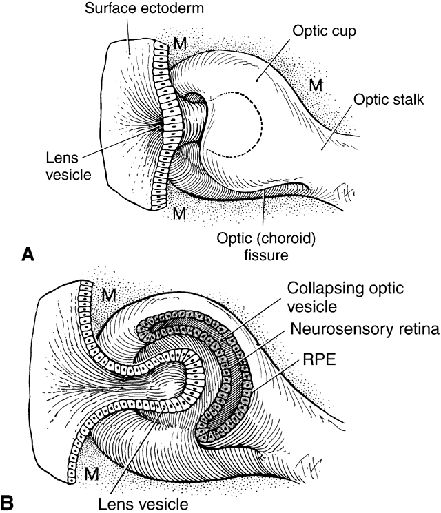 The optic vesicle and optic stalk invaginate through differential growth and infolding. Local apical contraction52 and physiologic cell death53 have been identified during invagination. This process progresses from inferior to superior so that the sides of the optic cup and stalk meet inferiorly in the optic fissure. The two lips of the optic fissure meet and initially fuse anterior to the optic stalk with fusion progressing anteriorly and posteriorly. Failure of normal closure of this fissure may result in inferiorly located defects (colobomas) in the iris, choroid, or optic nerve. Closure of the optic cup through fusion of the optic fissure allows establishment of intraocular pressure. Studies have demonstrated that, in the chick, the protein in the embryonic vitreous humor is derived from plasma proteins entering the eye by diffusion out of permeable vessels in the anterior segment.54 After optic fissure closure, protein content in the vitreous decreases, possibly through dilution by aqueous humor produced by developing ciliary epithelium. Table 2 lists the chronologic sequence of ocular development and comparative body-eye measurements in relationship to embryonic time intervals.