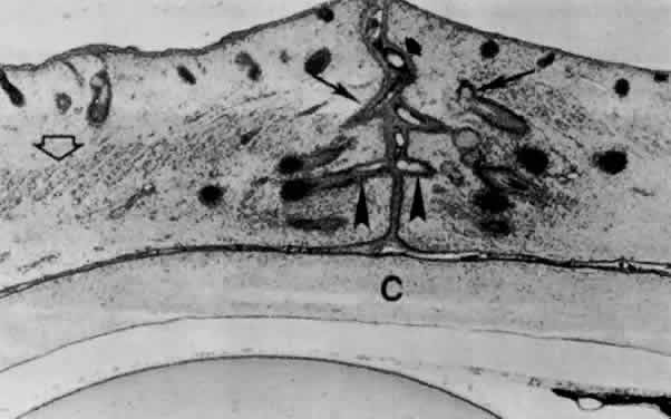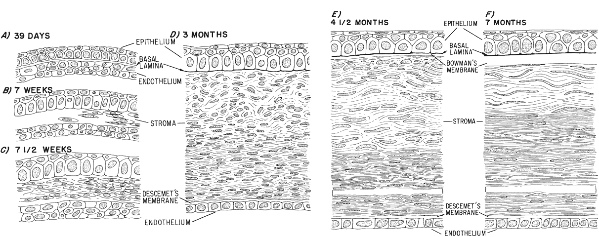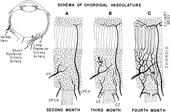 In the optic cup stage, the basement membrane lamella of the pigment epithelium is very well formed, but that of the choriocapillaris is either lacking or very delicate. The numerous fibroblasts in this region diminish later, leaving behind these collagenous fibrils. The interstitial spaces between the choriocapillaris channels are wide, and Bruch's membrane is bordered primarily by the collagen fibrils of the choroidal stroma. After midterm, the elastic component forms a nearly continuous fenestrated sheet. The collagenous layers thicken apparently without the direct intervention of fibroblasts, which now lie within the choroid. Incomplete basal lamina formation around the proliferating choriocapillary endothelia is the last component of Bruch's membrane to appear.156,188 |