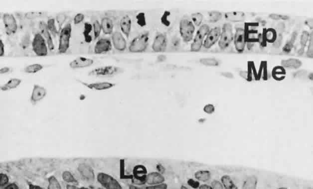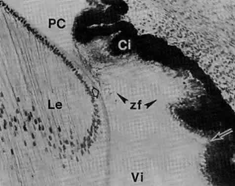 disc-shaped thickening of surface epithelial cells (27 days' gestation) (see Figs. 5B, 6, and 9A and B). A tight, extracellular matrix-mediated adhesion between the optic vesicle