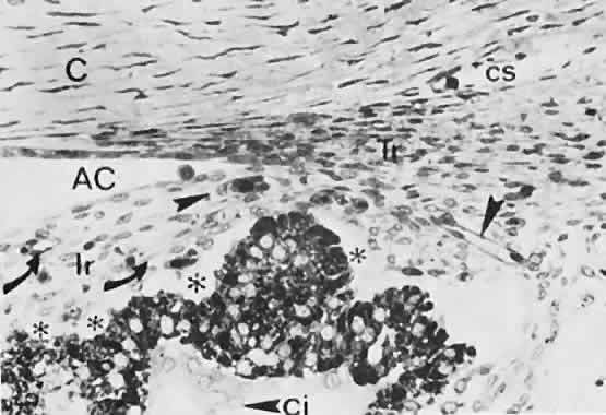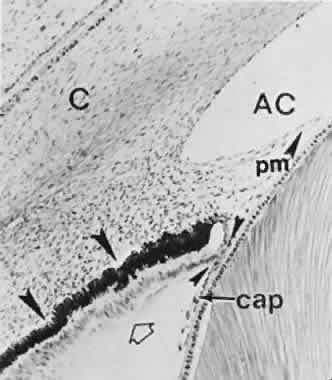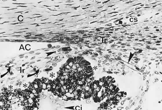 of the optic cup are oriented apex to apex. A thin basement membrane lines the inner (vitreous) aspect of the nonpigmented epithelium and retina. Apical cilia projecting into the intercellular space are seen at 4.5 months. There is also increased prominence of Golgi complexes and associated vesicles within the ciliary epithelial cells. These changes and the presence of “ciliary channels” between apical surfaces probably represent the first production of aqueous humor.121 IRIS The iris develops by anterior growth of the optic cup. The iris stroma develops from the same population of mesenchyme (neural crest) that forms the corneal stroma, corneal endothelium, and pupillary membrane. The neuroectoderm of the optic cup differentiates into the pupillary sphincter and dilator muscles and posterior iris epithelium and induces differentiation of iris stroma. Closure of the optic fissure is normally completed by 33 to 35 days' gestation. Failure of fusion of the fissure may result in an inferior (typical) iris coloboma alone or with iris hypoplasia. Tunica Vasculosa Lentis, Pupillary Membrane, and Iris Stroma In the 17 to 18 mm embryo (7th week), vascular outgrowths are seen extending from the rim of the optic cup over the anterior lens surface (see Fig. 16). Mesenchyme migrating into the space between the lens epithelium and corneal endothelium becomes the pupillary membrane during the eighth week (21 to 26 mm; see Fig. 12A, G, and H, and Figs. 16 and 18).81 The anterior chamber is then bounded anteriorly by the avascular corneal endothelium and posteriorly toward the lens by a thin, vascularized mesenchyme, the anterior portion of the tunica vasculosa lentis. The anterior tunica vasculosa lentis is continuous with the pupillary membrane, which is supplied by means of branches of the long posterior ciliary arteries and the major arterial circle (54 to 75 mm; Figs. 21 to 23). By the end of the third month, there is a rapid forward growth of both walls of the optic cup between the folded region and its margin (see Fig. 17A and B and Fig. 22). During the fifth month, a series of loops of vascular arcades reach centrally into the mesenchyme of the growing iris (see Fig. 23). These originate from branches of the long ciliary arteries. Immature tight junctions unite endothelial walls of the iris vasculature as soon as they are formed; there are no fenestrations.122 The arteriovenous loops of the pupillary membrane come to be arranged over the sphincter region and are the basis for the formation of the collarette. During the sixth month there is resorption of the axial (pupillary) portion of the pupillary membrane with subsequent atrophy of the blood vessels. The rest of the pupillary membrane disappears during the seventh and eighth month, not so much by dissolution as by remodeling of its constituents. The mesenchymal frame of the pupillary membrane is incorporated into the prospective iris stroma. Programmed cell death and phagocytosis by macrophages are involved in regression of the pupillary membrane. Dysfunction of any of these processes may play a role in the persistence of the pupillary membrane.123,124 Neuroectodermal Constituents of the Iris The inner layer of anterior portion of the optic cup differentiates into the posterior iris epithelium (continuation of the nonpigmented ciliary epithelium; Fig. 24). Pigmentation proceeds gradually from the pupillary margin, beginning at midterm (Fig. 25), toward the ciliary region and is completed during the seventh month. The smooth muscles of the pupillary sphincter and dilator muscles represent the only muscles in the body of neural ectodermal origin. In avian species, however, the pupillary muscles are striated and originate from stromal mesenchymal (neural crest) cells that migrate into the muscle bundles to become skeletal muscle cells.125 The first sign of differentiation of the sphincter muscle is the appearance of basal infoldings in the anterior epithelial layer (continuation of pigment epithelium) near the rim of the optic cup (see Figs. 17B and 25). This change is followed by reduced melanogenesis. At 3 months' gestation, fine fibrillar material is present in the basal part of these cells. In the sixth month, connective tissue septa and capillaries invade the muscle bundles and separate them from their origin, except at the pupillary edge. The muscle comes to lie free in the posterior mesenchymal layer (see Fig. 17D).126,127 The dilator muscle develops later than the sphincter with fibers identified in the sixth month. The first sign of their differentiation is the appearance of fine fibrils in the columnar cells of the anterior epithelium (see Fig. 17E). The myoepithelial cells have a spindle shape, are contractile, but remain attached to their anterior epithelial site of origin. A basal lamina covers cell surfaces facing the stroma. Capillaries or mesenchymal septa do not invade the sheet of the partially differentiated muscle, which continues to develop after birth.127,128 Melanogenesis Pigmentation varies according to individual or racial coloration. In the macaque, chromatophores are noted in the iris stroma until term, in contrast to the human in whom pigmentation occurs between 6 and 7 months' gestation.129 Melanosomes in the human iris are mature at term.130 Most chromatophores, as seen with the optic microscope, appear to develop postnatally. Pigmentation in the anterior border layer is insignificant. If the stroma has a scant collagen fibril content and is thin, it allows the pigment epithelium to peek through and a brownish color is noticeable. Blue irides have a transparent anterior border layer allowing interference or double refraction in the region of the stromal collagen. In the newborn, the superficially flat iris is not fully developed. The stroma is very thin and delicate with poorly formed connective tissue sheaths around the vessels. The collarette is nearer the pupil, but the anterior leaf is more completely develo