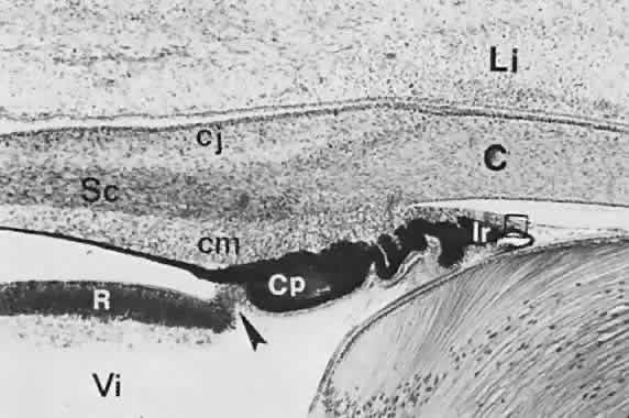 Regression of the peripheral branches of the hyaloid vasculature precedes zonular fiber appearance. During the sixth and seventh months of development (200 to 300 mm), the stainable vitreous regresses to its base on the pars plana and to its attachment to the lens (capsulohyaloidal ligament). Late in gestation, the fibers of the suspensory ligament (zonules) appear to originate from precursors in the valleys between the ciliary processes just anterior to the ora serrata. Early zonular fibers seem to be a continuation of the internal limiting membrane, which thickens over the nonpigmented epithelial layer covering the ciliary muscle.220,221 |