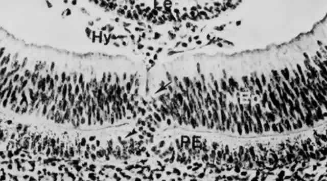 RETINA Retinal morphogenesis in humans and other species has been the subject of many investigations.139–158 Early Differentiation The primordium of the retina is present at the optic pit stage early during the third week of gestation even before closure of the neural tube (see Fig. 4A and B). The anterior part of the optic vesicle, the retinal disc, is the future neural retina, and has a marginal nonnucleated layer in contact with the lens placode. The sides of the invaginating vesicle are destined to become the pigment epithelium (see Fig. 9C and D). Following vesicle invagination to form the optic cup, the inner layer has an outer nuclear zone and an inner anuclear marginal zone. The outermost layer of cells of the nuclear zone (the germinating, or proliferative layer) projects cilia to the surface of the contacting outer layer, or future pigment epithelium. These cilia disappear during the seventh week. They are replaced by the precursors of the photoreceptor outer segments during the fourth month. The outer layer of the cup has two to three layers of pseudostratified columnar cells that enclose pigment granules at 33 days' gestation (7 to 9 mm). This layer produces the earliest pigmentation in the body. Punctate tight junctions near their apical ends join the cells. The basal lamina that originally surrounded the optic vesicle remains continuous over the inner (vitreal) and outer surfaces of the optic cup. The primitive retinal cells rest on a basement membrane that faces the inner future vitreal aspect and extend their apices toward the pigmented epithelial cells. In general, mitotic figures occur in the outer zone and prevail longest in the outer surface layer adjacent to the space representing the remnant of the primary optic cavity; and at the margin of the optic cup (future ciliary body-iris region). Mitosis first ceases in the central area; growth goes on longer in the periphery. Most cell division in the presumptive retina occurs before 120 mm (approximately 15 weeks). It is not established when mitosis ceases in the pigment epithelium. It is probably limited to the periphery in late fetal life. Formation of Layers Retinal differentiation commences when mitosis has practically stopped. It spreads from areas facing the future vitreous (marginal zone) toward the primary optic cavity, and from the center of the base of the optic cup (inner neuroblastic layer) toward its edge.159 Retinal ganglion cells and Müller's cells generally develop almost simultaneously. Here also, however, a gradient exists, given that axons and dendrites of ganglion cells near the optic nervehead differentiate earlier than those situated at the periphery. By proliferation and migration of cells, the neural epithelium separates into inner and outer neuroblastic layers in the seventh week of gestation (13 to 17 mm; see Fig. 11E and F). A few days later, a definite narrow nerve fiber layer is established, occasionally traversed by the radial fibers of the Müller cells. Immature ganglion cell bodies move into the inner neuroblastic layer along with other less mature cells, presumably future amacrines, creating in their wake a nuclei-free entanglement of processes, the transient fiber layer of Chievitz (Figs. 29A and 30A). With further realignment of cells, this layer is mostly obliterated by 8 to 10 weeks' gestation. At this period, the cells of the inner and outer neuroblastic layers intermingle by means of their cytoplasmic extensions. They fill up the previously acellular Chievitz layer; cell bodies shift positions, establishing a new, comparatively cell-free zone of intertwined processes, the inner plexiform layer (50 to 55 mm, approximately 10.5 weeks) (see Figs. 29B and 30B). With the emergence of the inner plexiform layer, an inner nucleated layer, consisting mostly of the cell bodies of ganglion cells, becomes separated from an outer neuroblastic zone. The cell bodies of the Müller's cells and the developing amacrines are located near the inner border of the outer neuroblastic zone. Bipolar cells differentiate mostly from the middle portion of this outer zone, whereas horizontal cells and photoreceptors arise from its outermost region (see Fig. 29B and C, and Fig. 30B and C). These developmental processes are well under way by 10 weeks to 12 weeks (approximately 60 to 80 mm), when an identifiable outer plexiform layer separates the immature horizontal and bipolar cell nuclei from those of the photoreceptors. Synaptogenesis precedes development of photoreceptor inner and outer segments by almost 2 months. Lamellar synapses start to form early in the fourth month in cone axons and bipolar terminals, as well as conventional synaptic complexes associated with amacrine cells; when these phenomena are operable, the cells are still immature. The newborn's retina has configuration and layers of the adult's. The photoreceptor outer segments are well developed and in contact with the pigment epithelium. Synapses of the outer plexiform layer are apparent (see Figs. 29D and 30D). Early in retinal morphogenesis, limiting membranes are established. Junctions of the zonula adherens type, representing the external limiting membrane of the retina are present in the fifth week between the outer plasma membranes of adjacent neuroblasts. A thin basal lamina exists over the inner surface of the marginal layer even before the lens vesicle formation. Contribution of basal laminalike material from developing Müller's cell processes combines with it to form the primitive internal limiting membrane. Photoreceptors The first indication of inner segment differentiation is the appearance of cilia in the outer cells of the external nuclear layer of the 10-week-old fetus. Later, the cell membrane becomes involuted, envelops the centriole, and forms a cylindric cytoplasmic process facing the apical portion of the developing pigment epithelium. Outer segment formation commences at 5 months. Outer segments start to develop when