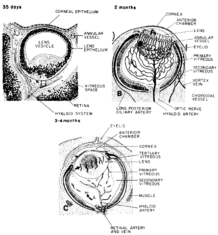 system and its regression.203–215 PRIMARY VITREOUS Hyaloid Vasculature The primary vitreous mostly consists of the hyaloid vasculature with some minimal associated matrix and cellular (neural crest) components. Vascular endothelia are of mesodermal origin. The matrix may be a combined secretion of the vascular and neural crest tissue. The primitive dorsal ophthalmic artery gives off the hyaloid artery, which passes through the optic fissure during the fifth week of gestation (see Fig. 33) and branches within the cavity of the primary optic vesicle (Fig. 36A; see Fig. 9A). Arborization of the hyaloid artery produces terminal branches around the posterior lens capsule (the tunica vasculosa lentis). Other branches surround the lens equator and anastomose with the annular vessel around the outer edge of the optic cup (see Fig. 36B). The annular vessel sends loops forward and centrally, which compose the anterior tunica vasculosa lentis. Near the margins of the cup, anastomoses occur between the annular vessel and terminal branches of the hyaloid artery. The hyaloid vasculature reaches its greatest development at about 9 weeks (33 to 40 mm; see Fig. 36B). Venous drainage from the vessels of the tunica vasculosa lentis and the pupillary membrane is accomplished through vessels that assemble into a net in the region where the ciliary body will subsequently arise. This plexus eventually communicates with venules of the choroid. No hyaloid vein is present. SECONDARY (DEFINITIVE) VITREOUS Development of secondary vitreous occurs during the seventh to eighth weeks, after closure of the optic fissure. A finer, more compact fibrillar network of monocytes and a small amount of hyaluronic acid characterize it.203–208,213,215,216 This newer vitreous also contains cells, the primitive hyalocytes, which most likely originate from the vascular primary vitreous (mesoderm) and the neural crest mesenchyme, rather than the retina. Collagen fibrils are produced by the hyalocytes and result in expansion of the secondary vitreous volume. Vessel walls of the hyaloid system consist of endothelial cells with a discontinuous mural cell covering.210,211 The nonfenestrated endothelium is underlined by a continuous basal lamina. Expansion of the vitreous is associated with an overall increase in the volume of the globe through active production of aqueous humor.54 Failure of closure of the optic fissure prevents this normal establishment of intraocular pressure necessary for globe expansion. This is one mechanism of (colobomatous) microphthalmia. REGRESSION OF HYALOID VASCULATURE Beginning first with the atrophy of the distal branches of the hyaloid, followed by that of the capillaries of the tunica vasculosa lentis, and finally by that of the hyaloid artery itself (at end of the fourth month), the primary vitreous retracts with the atrophying vessels (see Fig. 36C). By 160 mm (in the fifth month), atrophy of the vasculature posterior to the lens creates the funnel-like expansion of Cloquet's canal. Before the capillaries disappear, they are occluded by macrophages.217 Persistence of the primary vitreous and failure of the posterior tunica vasculosa lentis to regress results in persistent hyperplastic primary vitreous (PHPV).214,218,219 TERTIARY VITREOUS AND ZONULAR FIBERS The secondary vitreous in the anterior peripheral region at the rim of the cup contains thicker, presumably aggregated collagen fibers. Some of these fibers abut the proliferating mesenchyme near and between the lens and the rim of the cup by the end of the third month (65 mm). These fibers form the marginal bundle of Drualt (Fig. 37; see Figs. 21, 22, 24, and 36C). Here, the vitreous is firmly attached to the internal limiting membrane of the retina. This constitutes the embryonic aspect of the vitreous base.