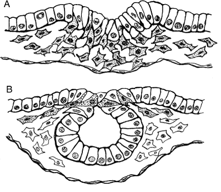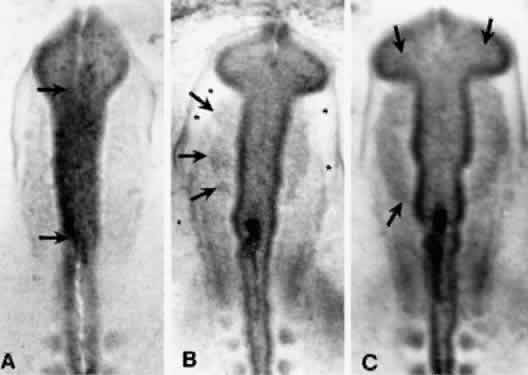 activin is clearly a major player. The body axis appears with the genesis of the node and primitive streak. HNF3 β, originally identified as a liver-specific transcription factor, is first found in the node, where it is required for proper morphogenesis of the primitive streak and notochord. In HNF3 β null mutants, anteroposterior patterning persists, but there is no node or notochord formation, and dorsoventral patterning is disturbed. Null embryos have abnormal streaks and affected foregut formation.14 The region just anterior to the node is called the “prechordal plate.” Mesoderm, largely responsible for dorsoventral and anteroposterior patterning of the body axis,15,16 also underlies the future eye-forming part of the prechordal plate, or “eye field,” before neural tube closure. This formation of mesoderm at the prechordal plate and its equivalents, which form the prosencephalon and diencephalon and related head structures will be discussed. Patterning of the prechordal plate differs substantially from that of the rest of the head and trunk. Caudal to the node there is clear rostrocaudal organization that is maintained by several genes. The Hox family of genes is the one best characterized.17 Development of most left-right body features follows this segmental plan, but the prosencephalon is not a part of this organization. It forms as a single, uninterrupted crescent-shaped area extending forward of the node, with no primitive streak. However, interruption of expression in the most anterior of the segmentally organized genes can have a direct impact on the anterior head segment. For example, the homeobox genes XLim1 (and its mammalian homologue Lim1) and KROX 20 are essential for establishment of anterior head structures. Both Lim-/- and KROX 20-/- mutants are truncated just rostral to rhombomere 3, in the metencephalon.18 Mesoderm is generated in the prechordal region, as elsewhere, by way of a process known as epithelial-mesenchymal transformation (Fig. 1A), through which epithelial cells lose their tight junctions and move between openings in the underlying basement membrane. Mesenchyme is a uniquely embryonic connective tissue best characterized by the absence of tight junctions between its highly mobile cells and the heterogeneous nature of its extracellular matrix (ECM). Mesenchymal cells advance by “pulling” themselves through the filaments of the ECM, a process that depends on the presence of certain cell adhesion-specific molecules in the ECM and complementary matrix adhesion-specific molecules on the cell surfaces. This has been demonstrated both in vitro and in vivo. For instance, when ectodermal explants are treated with heparinase to remove glycosaminoglycans, morphogenetic movements are inhibited and no mesoderm is formed.19 Mesoderm may be restricted, as opposed to induced, through the action of molecules such as bone morphogenetic proteins (BMPs), which are members of the transforming growth factor- β superfamily of signaling molecules. These molecules are important during the early fate-mapping process,20 although subsequently they may assume different signaling roles. BMP 3 inhibits noggin and goosecoid, thus restricting a subset of mesoderm contributing to the head and anterior trunk (“dorsal mesoderm”).21 Maternally derived BMP 2 promotes generalized mesoderm formation,22 whereas BMP 4 is more specific, inhibiting production of “dorsal” mesoderm and promoting differentiation of “ventral” structures, including the blood, pronephros, and visceral tissues.4 Ventral mesoderm induction can be regulated in part by suppression of the BMP proteins. An example is the recently characterized gene XIPOU2,23 which suppresses activation of goosecoid and XLim1 by activin, thus in turn suppressing BMP 4. If XIPOU2 is injected into the anterior pole of Xenopus blastulas, it reduces the eye field (as measured by Pax-6 gene expression), and the resultant tadpoles exhibit microphthalmia. The normal phenotype can be rescued by chordin. However, injection of XIPOU2 into the posterior vegetal pole produces axis duplication, two heads, and four eyes. This demonstrates the site-specificity of action of a given gene product, another feature that continues to change with development. The formation of mesoderm from transformed ectodermal cells completes the three primary germ layers; ectoderm, mesenchymal mesoderm, and endoderm. Next, many important lineage commitments relative to the eye and periocular tissues become established, the body axis becomes more fully defined, and dorsoventral, mediolateral spatial coordinates are becoming established through molecular signaling. One of the most important signals involved in axis definition is sonic hedgehog (SHH), which is the mammalian homologue of the Drosophila hedgehog gene. Until recently, it was known that the SHH protein was expressed along the body axis and the posterior margins of limb buds in ways that suggested that the role of this protein involved axial patterning. The SHH knockout mouse demonstrates a role in defining the midline of the body, reinforcing bilaterality, and promoting limb morphogenesis.24 The null phenotype is lethal and includes incompletely fused neural tubes with poorly defined ventral midlines, and severe cyclopia, expressed as one eye in a single frontal socket, with an overlying proboscis and no olfactory placode. Cyclopia results from incomplete bilateralization of the eye field, which is initially located in the prechordal plate (Fig. 2; also, see elsewhere in these volumes). When the prechordal mesoderm underlying the eye field of Xenopus embryos is removed, only one retina is formed.25 Part of the future prosencephalon, which later forms both the telencephalon and diencephalon, is set aside to form the eyes. This single crescent, or eye field, arises rostral to the primitive streak. The eye field expresses a gene, known as Pax-6, which is essential for eye formation. Transplantati