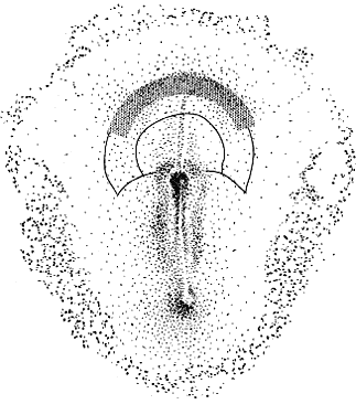 Like mesodermal mesenchyme, movements of neural crest cells depend on molecular interactions with the ECM. In the chick embryo, neural crest cell movements are disrupted if HNK-1, an antibody to a carbohydrate moiety involved in cell adhesion, is injected into the ECM along migration pathways.48 In albino axolotls, it has been shown that fibronectin, tenascin, collagens I and VI, and a chick aggrecan stimulate migration of crest cells, although in vitro the aggrecan molecule inhibits cell migration.49 This latter result is a dramatic reminder that cell responses to specific molecules within three-dimensional, intact organisms may differ substantially from behaviors in culture! The molecular structure of the ECM and epithelial tissue boundaries thus delineate migration routes of the neural crest cell.50–53 Continual modification of the ECM by the mesenchyme provides temporal control over crest cell migration as substrate qualities are altered.54–56 Therefore, correct morphogenesis at this time depends first on the initial spatial guidance of crest cells by the mesenchyme; second, on temporal control of crest cell migration by the ECM; and third, on the behavior of the crest cells themselves en route to their final destinations. One mode of action of Pax-6 involves controlling neural crest migration by facilitating movement of anterior midbrain crest cells forward into periocular and nasal areas.57 In mammals, crest cells first appear in the mesencephalic region prior to neural fold apposition and neural tube closure. This apparently precocious emigration occurs because neural tube closure begins in the future occipital or cranial cervical region (at the level of somites 2 through 7 in humans and 4 through 6 in rodents) and then proceeds cranially and caudally. In humans, those parts of the mesencephalic crest population that contribute to the periocular area emerge during the 4- to 12-somite period.43 A second group of crest cells is reported to emerge from the optic vesicle and sulcus (or diencephalic neural folds) during the 13- to 20somite period,43 although this population has not been experimentally traced in other species (Fig. 5). Although cranial flexure precedes neural crest migration in many mammals, including the human,43,58 in the avian and some reptiles the head of the embryo is still in a flat plane as the crest cells leave the neuroectoderm. Crest cells begin to migrate en masse laterally from atop the middle of the mesencephalon. Immediately ahead of the moving front of crest cells, the ECM expands, creating an acellular space filled with hydrated glycosaminoglycans, laminin, and fibronectin. The neural crest population moves laterally through this acellular matrix, then proceeds ventrally, following the body's contours. The first cranial (mesencephalic) flexure is a ventral folding at the midbrain level that brings the forebrain and paired eyes ventrally and caudally more than 90° with respect to the axis of the trunk, to a position just rostral to the floor of the mesencephalon. Later, the second (pontine) flexure, which is a dorsal folding at the hindbrain level, elevates the eyes and forebrain, bringing them forward about 30° with respect to the axis of the trunk. In the human, the midbrain cephalic flexure occurs early, beginning at the 1- to 3-somite stage, forming a right angle between the long axis of the forebrain and that of the hindbrain.59 Embryos at this stage are approximately 20 days old. By the 29th day, the pontine flexure is evident. During this interval, the eyes have changed considerably. The vesicles have become optic cups, the lens placode has formed a lens vesicle, the pigment epithelium has begun to produce melanin, eye muscle precursor populations are evident in the periocular area, and the eye has more than doubled in size (the actual proportion of growth varies among species). Expansion of the optic vesicle coincident with cranial flexure also brings about changes in the relations of mesenchymal cells to each other, including new contributions of mesenchymal cells from caudal sites of origin along the hindbrain. The neural crest cells that form the remainder of the dorsally situated population continue to migrate along surfaces of the optic cups (Fig. 6). It is important to recognize that the genesis of the neural crest, whether at open or closed neural folds, and whether early or later relative to cranial flexures, does not affect the fundamental relations between the sites of neural crest origin and the terminal location of neural crest or mesodermal populations.47,50,60–62 Crest cells arriving at the limbic region are prevented from further movement into the future corneal site by the presence of a dense meshwork of extracellular fibers that coalesce between the lip of the optic cup and the surface ectoderm. Many mesencephalic crest cells remain dorsal to the brain and migrate rostrally to join with those formed from the diencephalic neural folds. These populations appear to intermingle and then accumulate dorsal to the constricting optic stalks. Subsequently, some of these crest cells migrate ventrally along the caudal and cranial surfaces of each stalk (Fig. 7). Their movement around the optic stalk ceases when contact is made with the choroid fissure, which is tightly apposed to the ventral surface ectoderm. Asymmetric patterns of neural crest cell proliferation in the crest-derived mesenchyme immediately caudal to the choroid fissure cause cranial expansion of this tissue beneath the fissure, resulting in the formation of the maxillary and frontonasal processes. Detailed analyses of the migratory patterns of cranial neural crest cells indicate that periocular neural crest includes cells originating at several axial levels (diencephalic through mid-mesencephalic) that display different migratory pathways. (Differences in crest migration patterns have been studied in chick45,50,61,63–65 and mouse66,67). The presence of paraxial mes