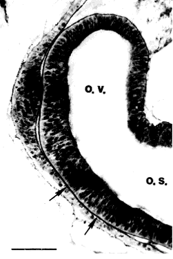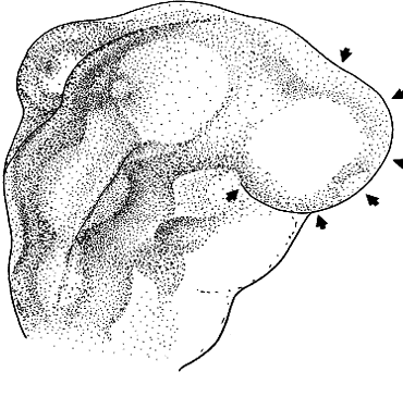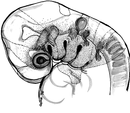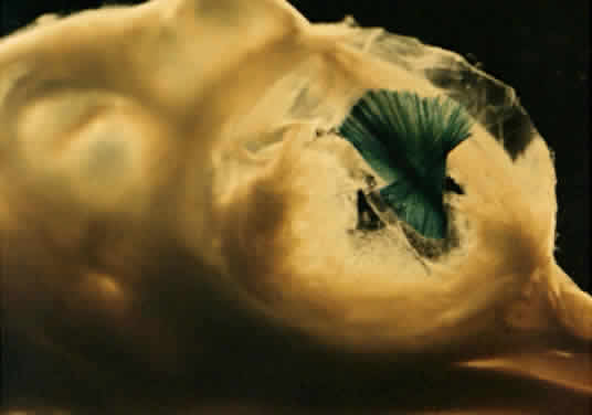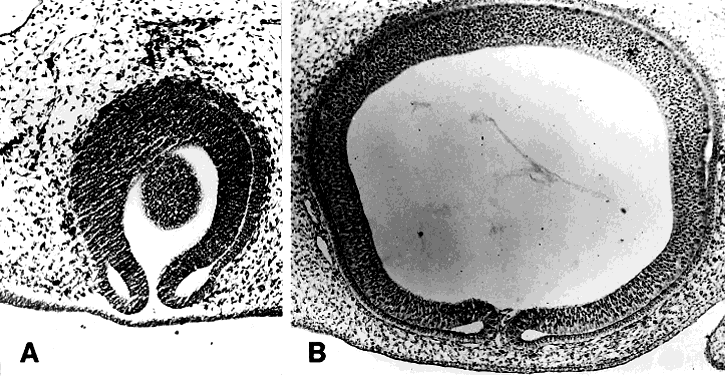 Human anophthalmia, aniridia, Peters' anomaly, and autosomal dominant keratitis are known to be linked to Pax-6 deficiencies.28–31 In the Pax-6-deficient mouse Sey-sey, eyeless homozygote dysmorphologies include abnormal midline connective tissues,32 perhaps reflecting the default outcome of prechordal ectoderm in the absence of Pax-6. Pax-6 is progressively downregulated until it is restricted to the lens and olfactory placodes. In Sey-sey homozygote mice that fail to form placodes, optic vesicles are formed, but involute.33 Perhaps the ultimate role of Pax-6 in eye formation is most dramatically demonstrated in Drosophila, in which artificial upregulation of the Pax-6 homologue eyeless results in ectopic eye formation all over the body, including the legs, antennae, and wings!34 This startling result, coupled with the prevalence of Pax-6 homologues among species, led the authors to suggest that Pax-6 may be a “master control gene” for eye morphogenesis. It also demonstrates that the general functions of many key regulatory genes have been conserved through thousands of milleniums of animal evolution. Usually, teratogenic agents are blamed for failure of the eye field to separate. For some years, veterinarians have been aware that pregnant ewes grazing on fields containing specimens of the weed Veratrum give birth to cyclopic lambs if they eat the plant during the first weeks of gestation.35 Earlier in this century, studies on eye formation led to the discovery that fish embryos exposed to magnesium in sufficient concentrations developed cyclopia.36 The percentage of larvae with cyclopia was dependent on the amount of magnesium in the water, whereas the severity of the phenotype (ranging from close-set eyes, to two eyes in one frontal orbit, to a true cyclops with one eye in a frontal socket) was determined by the length of the exposure. The most common teratogen affecting human births is ethanol, which disrupts the prosencephalon by limiting its size; the affected child may show microphthalmia, short palpebral fissures, deficiencies of the philtral region, and a long upper lip.37 The otherwise low incidence of cyclopia in nature suggests that chemical agents with the potential to cause major prosencephalic defects are not generally encountered, and that the window of development during which the embryo is vulnerable is short. The periocular area undergoes marked changes in tissue relations as the brain grows. As the flat neural tube expands mediolaterally, its walls form paired lateral outpockets called optic vesicles, which later become the optic cups (Fig. 3). The prechordal and paraxial mesoderm originally underlying the rostral neural plate expands laterally and rostrocaudally in congruence with the neural tissue until the evagination of the optic vesicles pushes adjacent mesoderm caudally and ventrally. This leaves the optic vesicle devoid of an enveloping mesenchymal layer except on its caudal (future temporal) surface. The remaining mesenchymal space posterior to these rudimentary optic vesicles is characterized simply as “paraxial mesoderm.” This mesenchyme is not displaced or migratory but consists of a uniform population of mesodermal, stellate cells located almost exclusively in the dorsal and ventrolateral (12 to 6 o'clock) positions. The remaining periocular area is acellular, consisting solely of ECM in the space between the optic vesicle and overlying ectoderm. Thus, the neural epithelium of the optic vesicle is in direct apposition to the surface ectoderm along its lateral and anterior surfaces. Normal development of the eye depends on the absence of mesenchyme in these areas, as has been demonstrated by the mouse mutant extra-toes, in which invasion of mesenchymal cells along the lateral margin prevents normal formation of the lens.38 In normal animals, mesenchyme that may become trapped between the invaginating optic vesicle and thickening lens undergoes necrosis and is resorbed. In a congenitally anophthalmic mouse strain, this trapped mesenchymal population failed to undergo apoptosis, and the normal sequence of necrotic loci in the developing eye was lacking.39 It is the failure of the lens placode to contact the optic vesicle as a result of inappropriately placed mesenchyme that results in anophthalmia among these genetically defective animals.33,40 The lens placode also plays a key role in ocular expansion, perhaps related to generation of the vitreous. Growth of the retina is unaffected by eye size, because the retina will continue to proliferate beyond the confines of a miniaturized eye. Mesenchymal processes that lead to expansion of the globe do not control or otherwise affect the mitotic rate within the retina. Retinal convolutions may fill the eyecups of microphthalmic or “anophthalmic” animals, a phenomenon that can be duplicated experimentally by the use of teratogens.41 |