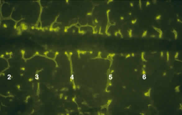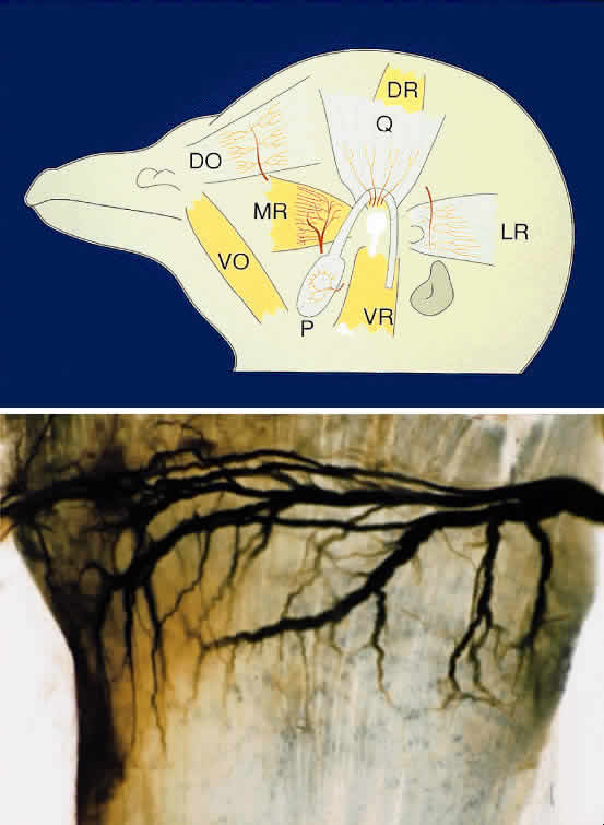 Much of the available experimental evidence indicates that myogenic cells have little role in establishing the gross spatial patterning of voluntary muscles. Nonbranchial somites grafted into prospective wing regions form normal wing muscles103; trunk somites grafted into the head make apparently normal extrinsic ocular or masticatory muscles104; and quail myotomes transplanted into chicks develop into typical chick muscles.105 These results complement neural crest grafting experiments in establishing the neural crest as the dominant pattern-generating peripheral tissue in the head. However, Wahl and Noden106 and Wahl and colleagues102 have found that some migrating myoblasts exhibit eye muscle-specific features, and that neural contacts are established with extraocular muscle myoblasts before their migration from the hindbrain paraxial mesoderm and before they contact neural crest cells. These results do not lessen the importance of crest cells in spatial organization; in fact, they show that this process is initiated earlier while eye muscle progenitors are still within paraxial mesoderm and close to the brain. Cues provided by early neural contacts may act together with local cues from the crest within the periocular mesenchyme, thereby integrating the spatial and functional organization of muscles within the orbit. Definition of myogenic cells within the paraxial mesoderm involves subtle changes on cell surfaces that enable myoblasts to coalesce and form condensed muscle primordia. Within this aggregate population, primary myotubes take shape, as described in a wide range of vertebrate embryos and neonates. Myotubes interact differently with the matrix than with undifferentiated mesenchymal cells. Laminin stimulates myoblast proliferation and process outgrowth.107 Fibronectin, hyaluronic acid, and prostaglandins are all involved in spatial organization of whole muscles.108 The myotubes themselves produce different types of collagen109 and display different nerve cell adhesion molecule distributions.110–112 There is also growing evidence that each whole muscle may have a unique “identity.” In the limb, muscles are known to exhibit individual patterns of innervation,113 a phenomenon that is also true of avian extraocular muscles (Fig. 11). What part of this uniqueness, or self-identity, is an intrinsic property of the myoblasts, and what part relies on the contribution of the muscle's connective tissues, is not clear. Myoblasts do have distinct identities before they reach the periocular area, as illustrated by the avian lateral rectus-pyramidalis/quadratus (LR-P/Q) complex. The pyramidalis (P) and quadratus (Q) muscles of avian eyes are homologues of mammalian retractor muscles, arising from similar origins. They lie between the globe of the eye and the rectus muscles, where their function is retraction of the nictitating membrane. The lateral rectus and the P/Q muscles arise as a single condensation from the paraxial mesoderm during neurulation (Fig. 12). Although the lateral rectus subset of the mesodermal condensation differentiates early, forming myotubes and becoming oriented in the orbit within a matter of 2 days, the P/Q precursors do not develop or proliferate for more than a week. During this lengthy period of embryogenesis, the P/Q cells move around the developing optic nerve and begin to proliferate and further differentiate only after most of the surrounding orbital tissues are in place.102 This shows that the two myoblast populations are distinct from each other before overt structural variation becomes apparent. VASCULAR ELEMENTS Angiogenic precursors are mesenchymal “wild cards.” Within embryonic mesenchyme they are universally invasive and move great distances through the embryo. Their behavior in epithelial contexts is more constrained. For example, the sites at which blood vessels penetrate the brain are initially defined at boundaries between rhombomeres (Fig. 13). Factors that may influence or control movements of angioblasts are not well studied. In Sturge-Weber syndrome, which produces “port wine stains” over parts of the face and neck innervated by the trigeminal nerve, correlations exist between the occurrence of upper facial dermal abnormalities and the incidence of ocular and leptomeningeal angiomas, which have not been described in patients whose dermal involvement is restricted to the mandibular and neck areas (reviewed in reference 65). Such syndromes may arise from local perturbations of the ECM, both initially, when the angiogenic precursors populate paraxial mesenchyme, and later on, when the vascular elements continue to exhibit uncontrolled growth in a localized region of the body instead of being down-regulated by local cues in the integument. In culture, increasing densities of fibronectin on precoated dishes causes endothelial cells to become more extended and to proliferate more rapidly.114 The importance of this integrin-mediated cellular attachment to the ECM in vivo has been demonstrated by blocking αvβ3 integrin binding with an agonist. Neovascularization was impaired, with clustering of angioblasts lacking normal protrusions, disruption of lumen formation, and abnormal vessel patterning.115