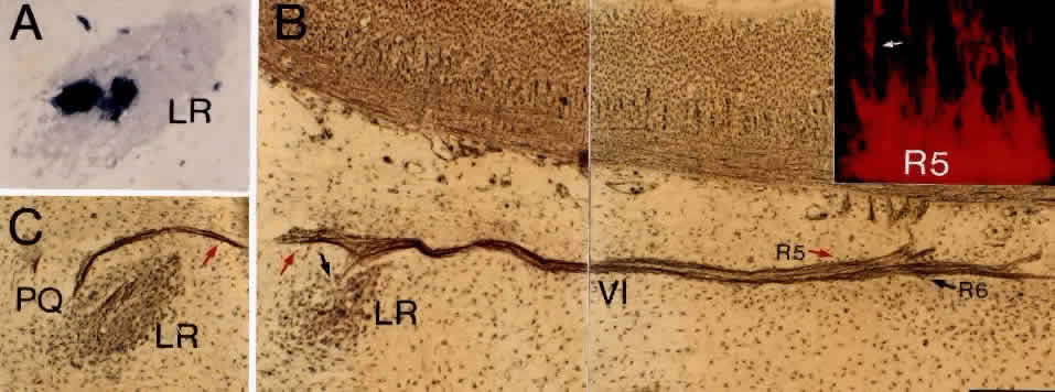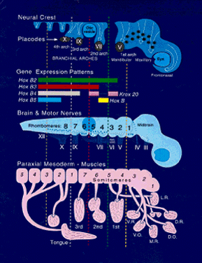 Certain relationships between various assemblies of cells during early tissue morphogenesis have been observed. For example, crest cell and mesodermal cell populations do not mingle at any time during the early stages; the interface between them is distinct. Later, cranial flexure and growth of the eye and branchial arches will cause this interface to become ambiguous. Penetrations by muscle-forming and vascular endothelium-forming mesoderm will continue to obscure the boundaries, and some periorbital skeletal tissues will derive from a dual mesodermal-crest origin.65,77,88 Pluripotency of crest cells in the periocular region has been demonstrated by transplanting periocular mesenchyme into the vicinity of embryonic gut tubes. The periocular crest was shown to differentiate into enteric ganglion and autonomic neurons, phenotypes these cells do not normally display.89 In a hormonally defined culture medium, mouse neural crest cells can also be induced to express a neuronal phenotype.90 Thus, the environment around pluripotent neural crest populations influences the timing, location, and phenotypic character of subsequent differentiation. Regulatory molecules such as analogues of retinoic acid, corticosteroids, and other components of serum selectively affect the development of crest-derived cells (see reference 51 for review). Morphogenetic events are also affected by basement membranes,69,91 and in the quail, cultures containing basement membrane matrix stimulate the differentiation of catecholamine-positive cells among pluripotent crest precursors while inhibiting the differentiation of other crest derivatives.92 Normally, migrating crest cells encounter basement membranes along the neural tube, somites (in the trunk), and ectoderm—locations in which peripheral neurogenesis is promoted. In the eye, the optic vesicle exerts an inductive effect on the periocular crest, stimulating the formation of the sclera.88,93–95 Similarly, anterior corneal epithelium promotes first the ingrowth of adjacent crest cells to establish the stroma and later the progressive, layered assembly of these cells into the compact, transparent cornea.96 In turn, the neural crest precursors that aggregate around the eye provide significant spatial programming information to nearby mesodermal cells (e.g., myoblasts) that move into the periocular region. Experiments in which presumptive jaw neural crest cells are transplanted to caudal head regions have resulted in the development of jaw-type structures (e.g., quadrate mandibular cartilages and bones) in an ectopic location.97,98 Furthermore, the assembly of myoblasts that move into this ectopic connective tissue-forming population is modified in accordance with the imposed jaw spatial organization.98,99 All this occurs before the overt differentiation of cartilages or myotendinous tissue. Thus, crest cells, destined to form skeletal elements, tendons, and muscular septa of the periocular region, exert a significant organizational influence on spatial morphogenesis of the myogenic cells with which they come in contact. Whether the periocular crest population generates this ability intrinsically or is itself responding to cues emanating from the optic vesicle is not known. EXTRAOCULAR MUSCLES In the spinal cord and hindbrain caudal to the ear, paraxial mesenchymal cells form new epithelial blocks, known as somites, by way of mesenchymal-epithelial transformation (see reference 52 for review). Subsequently, somites separate into rostral and caudal, medial and lateral portions, which represent early steps toward determination and delineation of the muscular, skeletal, dermal, and secondarily peripheral nervous system portions of each body “segment.” After the internal organization of the somites into discrete populations of myogenic, precartilaginous, and connective tissue components has occurred, many of these cells move out into the body walls and limbs, where they undergo final assembly and differentiation. In the head, however, the situation is different. Somites do not form. Scanning electron microscope studies reveal the presence of loose, serially arranged mesenchymal condensations within the paraxial mesoderm that are termed somitomeres. These do not become epithelia as do the somitic mesodermal cells. Although somitomeres are indistinct (and controversial) in avian and mammalian embryos, they are strongly evident in the shark.100,101 It has been suggested that discontinuities in the dorsal, outer surface of the paraxial mesoderm resulting from somitomere formation may have a profound effect on the pattern of morphogenesis of the neural crest, but experimental evidence for this is lacking. The six muscles of the oculomotor system, as well as the retractor bulbi muscles, arise from distinct myogenic condensations within the paraxial mesoderm.102 Exact maps of the origins of each muscle are obtained by injecting neurulating embryos with replication-incompetent retroviruses carrying a β-galactosidase marker. After the eye muscles assemble in the orbit, the embryo is fixed and stained to determine the location of the retroviral marker (Fig. 9). The resultant data show that the anteriormost muscle precursors are initially located lateral to, and then immediately caudal to, the optic vesicle. These are the medial rectus, ventral rectus, and ventral oblique muscles, which arise from a common myoblast condensation. The origins of some of these myoblasts can be traced back to a few progenitors that arise within prechordal mesoderm located immediately beneath the future eye-forming field in the neural plate. Ventrolateral to the mesencephalon lie the precursors of the dorsal rectus, followed by those of the superior oblique. The lateral rectus muscle arises even further caudally, ventrolateral to the metencephalon at the level of rhombomeres 3 and 4 (Fig. 10).