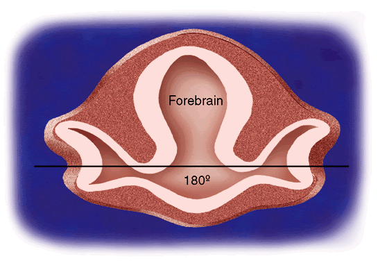 At the anterior end of the embryonic plate, three headfolds form: the forebrain, the midbrain, and the hindbrain. At the front of the forebrain, a small depression is noted on each side of the midline. This depression is the anlage of the eye and is called the optic pit. Toward the end of the third week of gestation, the optic pit deepens until it contacts the surface ectoderm and becomes the primary optic vesicle. At this stage, the eyes are at the side of the head at an angle of 180° (Fig. 2). The embryo consists of a head with the three divisions of the brain, a segmented body with spinal canal, and a tailfold. That portion of the mesoderm closest to the spinal canal is known as paraxial mesoderm. The primary optic vesicle then undergoes invagination to form the secondary optic vesicle or the optic cup. This starts at 2.5 weeks' gestation and is complete by 1 month.3–5