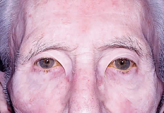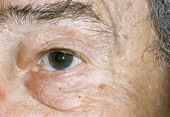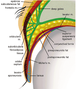 The skin of the eyelids is thin. The transition to the thicker skin of the eyebrow above and to the skin of the malar region below is abrupt. In the preorbital and preseptal skin, subcutaneous fat is sparse. Fat is absent in the pretarsal skin. Pretarsal skin is firmly adherent to the underlying tarsus because of attachments of the levator aponeurosis.16 Clinically, edema collects under the loose preorbital and preseptal skin, leaving an identifiable border at the pretarsal skin where there are denser subcutaneous fibroadipose attachments. |