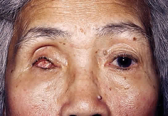 absent or is displaced inferiorally. The lower lid displays three creases. The inferior palpebral crease is less noticeable than the superior palpebral crease and marks the lower border of the lower tarsus. It courses from about 5 mm below the lower lid margin medially to about 7 mm laterally. The nasojugal crease is located below the medial aspect of the inferior palpebral crease and extends infralaterally at 45°. The malar crease originates lateral to and below the lateral canthus. It courses inferomedially until it meets the nasojugal fold 15 mm below the center of the lower eyelid margin. The palpebral fissure is the opening between the eyelid margins. The vertical palpebral fissure is normally 9 to 10 mm, whereas the horizontal fissure measures 28 to 30 mm. The upper eyelid rests at the upper limbus in the child and about 1 to 2 mm below the upper limbus in the adult. The upper and lower lids rest over the anterior surface of the globe, allowing about 20% of its surface to be exposed in the normal palpebral fissure. The lower eyelid is generally found at the level of the lower limbus. The upper eyelid is slightly curved, with the highest point nasal to the pupil. The lowest point of the lower eyelid is slightly temporal to the pupil. The point where the upper eyelid and the lower eyelid meet medially is known as the medial commissure. The point where the upper and lower eyelid meet laterally is known as the lateral commissure. The medial canthus and the lateral canthus are the angles formed at the medial commissure and at the lateral commissure, respectively. The lateral canthal angle is normally more acute than the slightly rounded medial canthal angle. The lateral commissure rests on the globe, whereas the medial commissure is anteriorly displaced by the caruncle and plica semilunaris. The superior orbital sulcus is that area between the upper eyelid crease and the superior orbital margin. With age or after enucleation, a concavity (Fig. 9) of the superior sulcus can be seen because of lack of supporting tissue. Convexity (Fig. 10) of the superior sulcus is seen with herniation of orbital fat.
