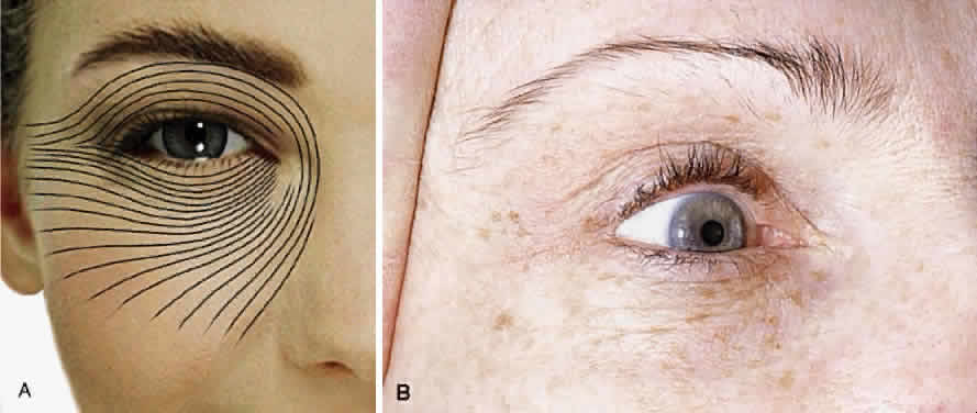 Langer lines (Fig. 11) are present in the upper and lower lids and in the canthal areas. These natural static skin lines are formed by collagenous, reticular, and elastic fibers in the reticular layer of the dermis. Gravitational lines (Fig. 12) are formed with age by progressive thinning of relaxed skin. In contrast, dynamic lines (Fig. 13) result from repetitious relaxation and contraction of paraorbital muscles. Horizontal forehead furrows show the lateral extent of the frontalis muscle used to correct chronic physiologic ptosis. The action of the procerus and corrugator superciliaris muscles create the “frown lines” between the eyebrows.
