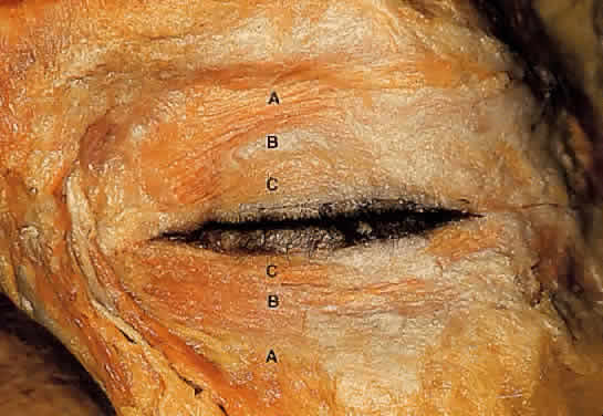 PROTRACTORS The orbicularis oculi muscle is a thin sheet of concentrically arranged muscle fibers covering the eyelids and periorbital region (Fig. 14). It is oval, with the long axis being horizontal, corresponding to the palpebral opening. Contraction of the orbicularis oculi muscle results in the protraction or closure of the eyelid. The orbicularis is firmly attached to the underlying lateral palpebral raphe, the medial canthal region, the insertions of the upper and lower eyelid retractors, the supraorbital ridge, the naso-orbital valley and the malar crease. Jones14,17 divided the orbicularis oculi muscle into three regions: orbital, preseptal, and pretarsal.