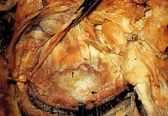 The orbital septum and the levator aponeurosis (Fig. 17) join 2 to 5 mm above the superior tarsal border. The orbital septum directly adjoins the posterior epimysium of the orbicularis for about 1 to 5 mm before joining the levator aponeurosis. The cross-sectional thickness of the orbital septum through its parallel lamella varies but is less than 1 mm. It is thickest at the arcus marginalis laterally and is thinnest in the lower lid medially. Medially, posterior orbital septal lamella are carried posteriorly by the pretarsal orbicularis muscle, which inserts on the posterior lacrimal crest. Superficial orbital septal fibers, as described by Whitnall,14 appear to cross and adhere to the lacrimal fascia before reaching the anterior lacrimal crest. At the lateral canthus, the orbital septum is also split; deep fibers insert at Whitnall's tubercle, whereas superficial fibers join at the lateral canthal raphe, just deep to the orbicularis muscle.23 Variation in septal strength is seen between individuals and varies with age. Clinically, weakness of the septum explains the medial upper lid bulge (bourrelet senile) seen in older patients and due to herniation of the medial fat pad through an attenuated septum (see Fig. 10).25 It also may explain the high incidence of orbital invasion of basal cell carcinoma in the medial canthal region.26 Lower Eyelid In the lower eyelid, the orbital septum (Fig. 18) arises from the inferior orbital rim as a condensation of the periosteum and the periorbita. It continues anteriorly and superiorly to a point 4 to 5 mm below the inferior tarsus, where it joins with the lower eyelid retractors and as a single structure inserts on the lower border of the inferior tarsus.23,27 Medially, the orbital septum splits and is carried posteriorly by the pretarsal orbicularis muscle (Horner's muscle) and attaches to the posterior lacrimal crest. Laterally, the orbital septum also splits and is carried deep by the insertion of the orbicularis. The orbital septa of the upper and lower eyelids form an anatomic barrier between the preseptal and orbital structures. Infectious processes anterior to the septa are considered to be more benign than those posterior to the septa. Functionally, the suborbicularis oculi fibroadipose layer and the multilayered orbital septum change with movement, enhancing eyelid and eyebrow mobility.14,23 FAT PADS Fat within the orbit and adnexa serve as a protective cushion within which the eyeball moves. Fat within the muscle cone is termed central or conal. Fat outside the muscle cone is termed peripheral or extraconal. Upper Eyelid In the upper eyelid, there are two specific fat pads: the medial fat pad and the central fat pad (Figs. 19 and 20). The whitish medial fat pad is more fibrous, whereas the larger central fat pad is more yellow because of a decreased amount of fibrous tissue. The larger central fat pad is termed the preaponeurotic fat pad. The trochlea separates the two fat pads.28 Clinically, the preaponeurotic fat pad lies directly on the surface of the muscular portion of the levator and serves as an important surgical landmark to the levator aponeurosis immediately beneath it. The medial fat pad often herniates through a weakened orbital septum, creating a bulge beneath the trochlea. The preaponeurotic fat is surrounded by a thin translucent connective tissue capsule. Fine connective tissue septa extend anteriorly from the capsule of the preaponeurotic fat to the orbital septum and posteriorly to the levator aponeurosis.23 Clinically, these connections are easily broken by blunt dissection, exposing an encapsulated preanoneurotic fat pad. Connective tissue septa also exists within the preaponeurotic fat, dividing it into lobules. Although the preaponeurotic fat pad is contiguous with deeper orbital fat, these connections are more rudimentary than the medial and lower eyelid fat pads. The preaponeurotic fat pad is less vascular than the other fat pads. Conversely, the medial fat pad is more vascular because of the location of the palpebral arterial arcade, which serpiginously courses through this pad.29,30 The medial fat pad is separated from the preaponeurotic fat pad by delicate fibrous septal attachments to the trochlea. Lateral to the preaponeurotic fat pad lies the lacrimal gland, which is typically pinker in appearance, firmer in texture, and distinctly more vascular than the preaponeurotic fat pad.31 During removal of orbital fat, the eyelid surgeon is careful to avoid injury to the laterally located lacrimal gland. Lower Eyelid In the lower eyelid, there exists a smaller temporal fat pad and a larger medial fat pad (see Figs. 19 and 20). The temporal fat pad lies inferior to the lateral canthus. It is separated from the larger medial fat pad by a fibrous extension from the periorbita and orbital septum infralaterally, joining with the capsulopalpebral fascia and Lockwood's ligament.28,32 The medial pad extends from the fascial band to the medial canthal area. It is a single pad anteriorly but posteriorly is divided by the origin of the inferior oblique muscle (Fig. 21). With this subdivision of the larger medial fat pad of the lower lid, some surgeons consider the lower lid to have three fat pads.15,32