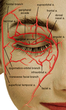 ARTERIAL SYSTEM The eyelids receive a rich and anastomotic supply of blood from the internal carotid system (the deep or intraorbital system) and the external carotid system (the superficial or facial system). Deep Arterial System At the orbital apex, the ophthalmic artery—a branch of the internal carotid artery—lies lateral to the optic nerve. As the ophthalmic artery passes over the optic nerve and supramedially within the orbit, four terminal branches pierce the orbital septum to supply the upper eyelid (Fig. 29). The four named branches are the lacrimal artery, the supraorbital artery, the supratrochlear (frontal) artery, and the dorsal nasal artery. The lacrimal artery is the most temporal branch and runs forward along the upper border of the lateral rectus muscle with the lacrimal nerve to supply blood to the lacrimal gland, the conjunctiva, and the lateral aspect of the upper eyelids.47 The lacrimal artery terminates as the lateral palpebral artery. The supraorbital artery arises from the ophthalmic artery as it courses over the optic nerve. The supraorbital artery travels forward in the orbit between the levator muscle and the periorbita of the orbital roof. It accompanies the supraorbital nerve through the supraorbital foramen to supply blood to the upper eyelid, scalp, forehead, levator muscle, periorbita, and diploe of the frontal bone. The supratrochlear (frontal) artery accompanies the supratrochlear nerve to supply arterial blood to the skin of the superior medial aspect of the orbit, the forehead, and the scalp. The ophthalmic artery continues dorsally and nasally within the orbit to terminate as the fourth branch, which pierces the orbital septum and is known as the dorsal nasal artery. It supplies the skin of the bridge of the nose and the lacrimal sac. It terminates as the medial palpebral artery. The medial palpebral artery and the lateral palpebral artery richly anastomose to form two well-defined arterial arcades in each upper eyelid—the marginal palpebral arcade and the peripheral palpebral arcade. The marginal palpebral arcade lies on the anterior tarsal surface 2 to 3 mm from the eyelid margin. The peripheral palpebral arcade parallels superior to the superior border of the tarsus, posterior to the levator aponeurosis, and anterior to Müller's muscle (Fig. 30). Medially vascular arcades have a serpiginous course through the medial fat pads of the upper eyelid, which may result in bleeding if incised during eyelid surgery.30 The deep peripheral palpebral arcade supplies the superior conjunctival fornix and anastomoses with the anterior ciliary arteries near the corneal scleral limbus.