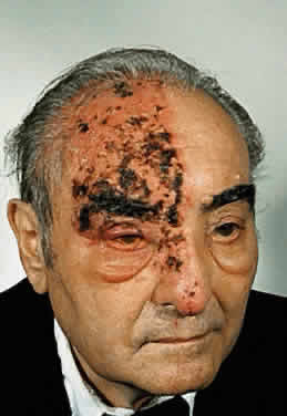 The first or ophthalmic division (CN V1) of the trigeminal nerve runs forward in the middle cranial fossa to enter the lateral wall of the cavernous sinus. It then enters the orbit through the supraorbital foramen, where it subdivides into three branches: the lacrimal, the frontal, and the nasociliary nerves. The lacrimal nerve enters the orbit above the annulus of Zinn. The lacrimal nerve gives sensory innervation to the lacrimal gland, the lateral aspects of the eyelid, and the lateral forehead. It courses anteriorly in the orbit along the lateral orbital wall between the superior rectus muscle and the lateral rectus muscle to enter the posterior aspect of the lacrimal gland.47 Here it divides into a superior and inferior division; the superior division sends sensory fibers to the lacrimal gland and skin as the lateral palpebral nerve. The inferior division also innervates the gland and anastomoses with the fibers from the zygomaticotemporal branch of the maxillary division of CN V2, which carries parasympathetic secretory fibers to the lacrimal gland from CN VII.42 The frontal nerve also enters the orbit above the annulus of Zinn. It is the largest subdivision of the ophthalmic nerve and courses anteriorly in the orbit superior to the levator muscle and inferior to the periosteum of the orbit to terminate as two branches: the supraorbital nerve and the supratrochlear nerve. The supraorbital nerve leaves the orbit through the supraorbital foramen or supraorbital notch to innervate the skin of the upper eyelid, forehead, and scalp. The supratrochlear nerve passes above the trochlea and emerges at the superior nasal aspect of the orbit through an opening in the orbital septum. It gives sensory innervation to the medial commissure, the lacrimal drainage structures, the skin of the root of the nose, and the middle of the forehead.50–52 The supratrochlear nerve also sends an anastomotic branch to the infratrochlear twig of the nasociliary nerve. The nasociliary nerve enters the orbit laterally within the annulus of Zinn. It passes over the optic nerve below the superior rectus muscle to run along the medial wall of the orbit between the superior oblique muscle and the medial rectus muscle. It then gives off several branches: (1) the long sensory root of the ciliary ganglion; (2) the long ciliary nerves, which pass anteriorly into the suprachoroidal space to supply sensory fibers to the iris, ciliary body, and cornea; (3) the infratrochlear nerve, which is sensory to the medial canthus, conjunctiva, lacrimal sac, canaliculi, and caruncle; and (4) the posterior ethmoidal nerve which is sensory to the ethmoidal air cells and sphenoid sinus.14,51 Clinically, patients with herpes zoster ophthalmicus who have skin lesions and associated kerato-uveitis (Hutchinson's sign) have involvement of the nasociliary subdivision of CN V1 (Fig. 35).