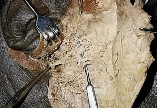 In the lower eyelid, a well-developed marginal arcade is found anterior to the tarsus, 2 to 3 mm from the eyelid margin. The peripheral arcade is less well developed.14,48 These arcades arise in the lower lid, as in the upper lid, from the medial palpebral branches and from the lateral palpebral branches. They also receive lateral anastomoses from the zygomatico-orbital branch of the superficial temporal artery. Superficial Arterial System The facial system (Fig. 31) is derived from the external carotid artery and gives off three branches that eventually supply the eyelid—the facial artery, the superficial temporal artery, and the infraorbital artery. The facial artery crosses over the mandible anterior to the masseter muscle and courses diagonally to the nasolabial fold. It courses between the levator labii superioris muscle and levator alae nasi muscle to become the angular artery. The angular artery lies within the orbicularis oculi muscle 6 to 8 mm medial to the medial canthus and 5 mm anterior to the lacrimal sac. The angular artery perforates the orbital septum above the medial canthal ligament to anastomose with the dorsal nasal branch of the ophthalmic artery. The superficial temporal artery is a terminal branch of the external carotid, which courses posterior to the angle of the jaw and in front of the ear. It lies beneath the skin but superficial to the fascia of the temporalis muscle.28 The superficial temporal artery gives off three branches to supply the eyelids—the frontal branch, which courses upward across the temple to supply the frontalis muscle of the forehead and the orbicularis oculi muscle anastomosing with the lacrimal and supraorbital arteries; the zygomatico-orbital branch, which courses along the upper border of the zygoma supplying the upper eyelid and anterior orbit; and the transverse facial branch, which runs below the zygoma to supply the malar region and the lateral aspect of the lower eyelid to anastomoses with the lacrimal and infraorbital arteries. The infraorbital artery enters the orbit through the pterygopalatine fossa and passes through the posterior end of the infraorbital fissure, through the infraorbital canal, and exits the orbit through the infraorbital foramen to give a rich contribution of arterial blood to the lower eyelid. The infraorbital artery is a branch of the internal maxillary artery. VENOUS SYSTEM Like the arterial system, the venous system has both a superficial and a deep distribution. The superficial system consists of the angular vein, the anterior facial vein, and the superficial temporal vein. Branches of the deep venous system involving the eyelids consist of the superior ophthalmic vein and the inferior ophthalmic vein. Superficial Venous System The angular vein is formed by the junction of the superficial frontal vein from the forehead and the deep supraorbital vein from the orbit. The angular vein is located about 8 mm medial to the inner canthus and lies lateral to its artery deep in the skin (Fig. 32). Venous blood from the angular vein has a dual drainage: posteriorly into the deep venous system by the superior ophthalmic vein or superficially and inferiorly into the anterior facial vein. The anterior facial vein crosses the mandible and joins the posterior facial vein to form the common facial vein, which then drains into the internal jugular vein. Superiorly and laterally, venous blood from the forehead, eyebrow, and eyelid drain from the supraorbital vein into the superficial temporal vein, then pass in front of the ear to drain into the external jugular vein.14,28,49 Deep Venous System The supraorbital vein drains the forehead, eyebrow, and upper eyelid and runs horizontally deep to the orbicularis oculi muscle to course medially into the frontal vein and then into the superior ophthalmic vein. The superior ophthalmic vein is formed at the supranasal aspect of the orbit by the union of the angular and supraorbital veins. It travels posteriolaterally into the orbit, penetrates the muscle cone in the mid-orbit, and receives venous drainage from the superior vortex veins of the globe. It then leaves the orbit near the annulus of Zinn by the superior orbital fissure to enter the cavernous sinus. When present, the inferior ophthalmic vein begins as a plexus near the anterior aspect of the orbital floor. It receives venous blood from the lower eyelid, lacrimal sac, inferior rectus muscle, inferior oblique, and the two inferior vortex veins. It courses posteriorly to divide into two branches: a smaller branch to the pterygoid plexus by the inferior orbital fissure and a larger branch into the superior ophthalmic vein to enter the cavernous sinus. Occasionally, a larger branch may drain directly into the cavernous sinus. Other branches of the deep orbital system include the central retinal vein, the anterior ciliary veins, and the cavernous sinuses. LYMPHATIC SYSTEM TO THE EYELIDS The lymphatic system of the eyelids has two divisions: a superficial system and a deep system.14,49 The superficial system drains the skin and orbicularis oculi muscle, whereas the deep system drains the tarsi and the conjunctiva. Most of the upper eyelid,lateral third of the lower eyelid, and lateral canthus drain into the preauricular and deep parotid nodes (Fig. 33). They eventually empty into the deep cervical nodes near the internal jugular vein. The medial portion of the upper eyelids, the medial canthus and the medial two thirds of the lower lid and conjunctiva drain into the submandibular nodes by channels following the angular and facial veins. Lymph drainage eventually empties into the internal jugular vein. |