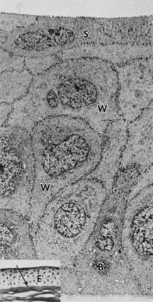 The 300-nm thick glycocalyx (buffy cell coat) of the apical membrane can be preserved intact for histologic evaluation.7,8,19 The glycocalyx is composed of glycoprotein material, and numerous separate fine filaments become visible on the apical surface after tannic acid staining (Fig. 6). These filaments cover the tips and sides of the microplicae and microvilli extensively, inserting into the cell membrane. Angular bends and filament branching are evident, as well as a beaded substructure.19 The shortest filaments are 150 nm in length in the central cornea, while filaments 300 nm long are found on the conjunctival cell surfaces.19 The glycocalyx binds loosely with the overlying mucous layer and provides binding sites for immunoglobulin present in the tears.7 The margins of the apical cell membrane possess the important tight junctions surrounding the cell circumference near the apical margin.20 This junction complex is the correlate of the paracellular pathway of high resistance to ion flow. The lateral and basal membranes of the apical cells have gap junctions, numerous desmosomal junctions, and numerous membrane-bound vesicles. The cytoplasm contains a flattened nucleus (which probably disintegrates prior to desquamation), few organelles, and a notable increase in tonofilaments compared with the underlying cells. There are some aggregates of glycogen granules, small mitochondria, sparsely distributed free ribosomes, and poorly developed Golgi's complexes. Cytoplasmic vesicles are fairly numerous.21 WING CELLS Wing cells are distinguished by a variety of polygonal shapes and by their large ovoid nuclei. The cells are roughly 12 to 15 μm in diameter, and their cytoplasm contains few rough endoplasmic reticulum cisternae, mitochondria, or Golgi's complexes. The large numbers of cytoskeletal tonofilaments are approximately 8 nm in length, and numerous interdigitations exist along the cell membranes.21 Desmosomal and gap junctions are seen between adjacent wing cells and between basal and apical cells (Fig. 7). BASAL CELLS Basal cells appear as elongated polygonal cells approximately 10 μm in width and 15 to 20 μm in height, with prominent ovoid nuclei. The polygonal nature can be readily discerned in confocal microscopy images of the basal cell layer (Fig. 8). Buschke and associates22 showed that cell mitosis occurs in only 1 of 250 basal cells of the rat epithelium. In their study, mitosis occurred in irregular clumps of three to six cells, and mitotic cells were much more numerous in the periphery. The basal cell cytoplasm appears similar to that of the wing cells, as do the anterior and lateral cell membranes with their complement of desmosomal attachments. However, the basal membrane is notable for the presence of hemidesmosomes, which are discussed below. |
