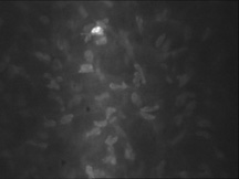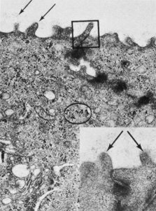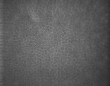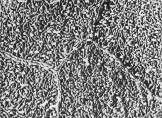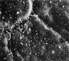 As the cell matures, its specular microscopic appearance tends to darken (Fig. 4). This may be due to changes in surface texture, because microvilli densely cover the apical membrane at this stage of development.4,19 Prior to cell exfoliation, apical surface margins tend to appear smooth, with microplicae clustered only near the center. In its final stages the biomicroscopic appearance of the cell surface appears darker than in its earlier stages (Fig. 5).