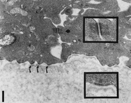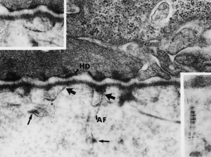 HEMIDESMOSOMES The epithelial basal cell hemidesmosome is a multilayered junctional structure associated with the basal membrane, with intracellular keratin filaments (intermediate filaments) entering along its cytoplasmic aspect. As basal epithelial cells migrate in response to wound healing, hemidesmosome junctions are observed to disassemble and their integrin components diffusely distribute across the basal cell membrane.23 In vitamin A-deficient rat models, the severity of epithelial sloughing was found to correspond to the size and frequency of residual hemidesmosomes.24 Kurpakus and colleagues25 found a monoclonal antibody, mAb6A5, that was directed against a 200-kd polypeptide component on the cytoplasmic exposure of the hemidesmosome. This component may be associated with the electron-dense plate that is seen crossing through the intermediate filaments just proximal to the hemidesmosome plaque.26 Short filaments pass from the dense plate into the plaque. Polypeptides of 180 and 230 kd were isolated by Owaribe and co-workers26 and localized to the hemidesmosome plaque. The 230-kd component was found to be the bullous pemphigoid antigen (BPA), while the 180-kd component was heavily glycosylated, making it a candidate for a transmembrane glycoprotein. In addition, major polypeptides of 120, 200, and 480 kd were isolated from the region and may be hemidesmosome structural components as well.26 Stepp and associates,27 using direct immunofluorescence of frozen sections, found β1, β4, and β5 integrin subunits and α3, α5, α6, and αv subunits localized in the epithelium. Specifically, α5, α6, and β4 subunits of integrin heterodimers were found to be localized on the basal membrane side of the hemidesmosome site, while β1, β5, α2, α3, and αv were localized to sites associated with cell-t-cell contact.27 A 125-kd polypeptide was isolated to the basal side of the hemidesmosome by Kurpakus and co-workers28 with the monoclonal antibody mAbHD. This polypeptide may be a protein associated with the anchoring filaments that span the lamina lucida from the hemidesmosome plaque to the basal lamina. Fluorescence confocal imaging of the integrin subunits α6 and β4 indicated that the α6 subunits were localized to both the basal and lateral surfaces of the basal epithelial cell, but the β4 subunits were present only along the basal floor of the cell. The number and distribution of hemidesmosomes do not appear to vary with age; however, discontinuous staining for the α6 subunits in corneal epithelium of individuals over the age of 70 has been noted.29 BASAL LAMINA Basement membrane is secreted extracellularly by the epithelial cells and forms one of several structural components associated with cell adhesion to Bowman's layer or stroma. With light microscopy, a densely stained basement membrane approximately 75 to 100 nm thick is visible.21 Under the high magnifications of electron microscopy, this layer appears distinctly laminated. Anteriorly, the lamina lucida appears as a clear, electron-lucent zone approximately 23 nm thick, while the lamina densa that lies apposed to Bowman's layer is an electron-dense region approximately 48 nm thick.21 It has not been established how basal lamina adheres to Bowman's layer. A third component of the basement membrane is the reticular lamina, which lies distal to the lamina densa and is within Bowman's layer. This region includes the anchoring fibrils and plaques and other electron dense materials associated with the lamina densa (Fig. 9). Numerous electron-dense, fine filaments are observed clustered within the lamina lucida; they course from the hemidesmosomes of the basal epithelium and insert into neighboring regions on the lamina densa. Within the lamina lucida, a dense plate often can be seen interposed along the filaments and lying parallel to the hemidesmosome plaque. The precise composition of these filaments and the dense plate is uncertain, but the 125-kd polypeptide described previously may be involved.28 In addition, the antihuman monoclonal antibody, 19-DEJ-l, was found to be reactive to the antigenic epitope of either the anchoring filaments or the dense plate through the filaments.30 ANCHORING FIBRILS AND PLAQUES Within the anterior aspect of Bowman's layer, fine filaments travel distally from the lamina densa near the proximal insertion of the anchoring filaments and immediately coalesce to form striated anchoring fibrils approximately 0.15 μm in width (Fig. 10).31 These anchoring fibrils then course posteriorly to an average depth of 0.60 μm in the adult human and terminate in electron-dense regions called anchoring plaques.31,32 Maximum penetration depths of 2.05 μm were reported for the anchoring fibrils in humans. Some anchoring fibrils may terminate among the type I collagen fibrils31 or return proximally to reinsert into the lamina densa at a neighboring site.32 There also appear to be plaque-to-plaque anchoring fibrils. Anchoring fibrils found in Bowman's layer appear similar to those found in the stroma of the rabbit, a species that lacks Bowman's layer.31 Anchoring fibrils were found to be type VII collagen filaments in bovine32 and human corneas31 using immunogold labeling and immunofluorescence staining techniques, respectively. Type VII collagen is a dimer of high molecular weight.33 Each monomer has a helical domain and a globular, carboxyl domain. The dimer is created by disulfide bonds linking the tails of the monomers together, and striated fibrils are formed by the nonstaggered arrangement of the helical filaments. The globular domains were found localized within the anchoring plaques, which also label for type IV collagen.30 Gipson and co-workers31 and Keene and colleagues32 presented similar models for the architecture of the anchoring fibril network and indicated that the striated type I collagen fibrils in Bowman's layer must be interwoven and trapped by the anchoring fibril network (Fig. 11). BASEMENT ME