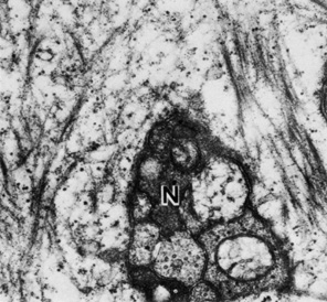 such as Fuchs' dystrophy.87 As noted previously, Descemet's membrane does not adhere strongly to the stroma, and it can be surgically dissected as a sheet. The randomly oriented collagen fibers in the interfacial matrix of the stroma have a densely matted appearance,40 and 22-nm thick fibers arising from the matrix penetrate Descemet's membrane to a depth of only 0.16 to 0.21 μm.88 The banded anterior zone is composed of numerous precisely aligned sheets forming a three-dimensional array or lattice.21 Each sheet of the array is constructed from triangular elements with densely staining nodes at the apices. The separation between nodes is approximately 100 to 110 nm. The highly ordered arrangement of the nodes causes the banded appearance seen in cross section. In the posterior unbanded zone, the appearance is of a homogeneous, fibrillogranular region. The anterior unbanded zone also has a fibrillogranular appearance but is extremely difficult to discern visually (Fig. 18).86 The composition of Descemet's membrane is primarily collagen. Marshall and colleagues34,48 found immunogold labeling for collagen types III and IV in the posterior unbanded zone, type IV in the anterior banded zone, and types V and VI in the anterior unbanded zone and at the interfacial matrix of the stroma. In addition, long striated collagen V labeled filaments were seen within Descemet's membrane immediately adjacent to the endothelial cells. These filaments may be the same as those occasionally seen with specular microscopy2 and by electron microscopy86 but do not appear to be associated with the extensive striated distribution found with disease-related states. Tamura and associates89 also found collagen type VIII strongly labeled in the anterior banded zone using immunohistochemical localization for monoclonal antibodies. |