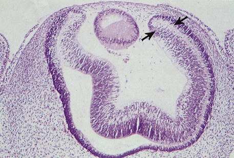aniridia.8–9 Embryologically, the structure of the iris can be divided into two different developmental layers: iris pigment epithelium (IPE) of neuroectodermal origin and iris stroma of neural crest origin. The cells of the IPE arise from mesoderm, and the stromal blood vessels begin as penetrating branches from the developing vascular network of the ciliary body (Fig. 1). Although data regarding the origin of both iris muscles (sphincter and dilator) are incomplete, they likely arise from neuroectoderm.4,6 The embryologic precursors of the iris are first visible at six weeks gestational age. The neural ectodermal derivatives (iris epithelium and muscle) arise from the anterior rim of the optic cup. At about six weeks gestational age, these cells begin to proliferate rapidly and extend anteriorly.10 During development, an apparent dilation, called the marginal sinus of von Szily, can be seen at the tip of the optic cup between the two layers of epithelium. Although this sinus is now thought to represent an artifact, the two layers of neuroepithelium become functionally divided into the anterior and posterior pigment epithelium (Fig. 2).11 Embryologically, the anterior epithelium becomes pigmented while still part of the optic cup; however, the pigmentation of the posterior epithelium (derived from the inner, unpigmented layer of the optic cup) occurs later, proceeding toward the ciliary region, and is completed by seven months gestation.12 Differentiation of the iris stromal elements begins slightly earlier than iris neuroepithelial growth and proceeds as a wave of mesenchymal migration at about six weeks' gestation. This forms the anlage of iris stroma, a continuous papillary membrane, and the tunica vasculosa lentis (a transient vascular network that supplies the developing lens). Iris stromal pigmentation does not occur until after 24 weeks. The developing iris lacks a pupil because the original stroma is a continuous sheet of tissue with epithelial cells growing inward, toward the center of the iris.4,11 The vascular framework of the iris also begins at six weeks as a blind axial outgrowth from the annular vessels in the mesenchyme associated with the rim of the optic cup and forms the anterior part of the tunica vasculosa lentis (lamina iridopupillaris). By the third month, branches of the nasal and the temporal long posterior ciliary arteries unite with peripheral vessels of the lamina iridopupillaris to form the major arterial circle. The pupil is created by cellular and vascular remodeling of the iridopupillary membrane during the fifth month of gestation.4,11 The development of the iris sphincter muscle first appears as basal infoldings in the cells of the anterior layer of neuroepithelium and can be seen by light microscopy at about eleven weeks. By the fifth month, myofibrils begin to be synthesized by the developing tissue; the muscle comes to lie free in the posterior mesenchymal layer by the eighth month of gestation. The formation of the dilator muscle fibers occurs later and is first identified in the sixth month as fine fibrils in the anterior iris epithelium. The iris is near its adult size at birth. The most dynamic changes occur in the first few postnatal years and involve the color of the iris and the extracellular matrix. Embryologically, the anterior epithelium becomes pigmented while still part of the optic cup; however, the pigmentation of the posterior epithelium (derived from the inner, unpigmented layer of the optic cup) occurs later, proceeding toward the ciliary region, and is completed by seven months' gestation. Postnatal changes in iris color occur by the gradual accumulation of melanin in the stroma and anterior border layer as discussed later. |