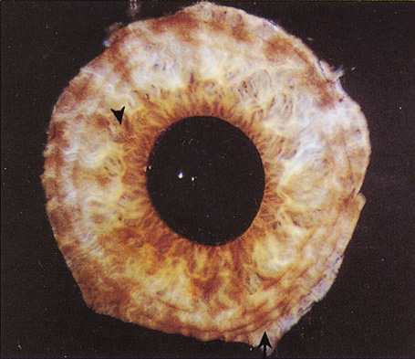 Blood supply to the iris originates in the major arterial circle, which lies in the stroma of the ciliary body near the iris root. The vessels have a slight corkscrew shape to accommodate iris dilation and contraction. Branches travel in the anterior iris stroma, extending toward the collarette where they form an incomplete minor arterial circle. Numerous vessels from the minor arterial circle form vascular arcades that course toward the pupillary margin to supply the sphincter muscle and also travel along the dilator muscle toward the iris root. The endothelial cells along the iris vessels are connected by tight junctions and, thus, are impermeable to macromolecules, except during periods of inflammation, as seen with uveitis.24 Venous channels follow a similar course as the arterial system of the iris; however, there is no venous equivalent of the major arterial circlet, and the venous system of the iris eventually drains into the vortex system and ciliary plexus.7 |