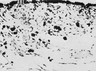 as an early light-absorbing layer of the iris.29,30 Eagle16 found relatively constant numbers of melanocytes in the anterior border layer of all irides, regardless of iris color. However, he found that darker irides had more abundant and larger melanin granules, and that the cytoplasmic volume of melanocytes was increased (due to an increase in pigment volume) in darker irides. Eagle also studied features of the anterior border layer of different color irides extensively using a scanning electron microscopic. Lighter irides have delicate processes, and their anterior borders have an intricate plexiform character. Darker irides have fewer processes, which are stout and less dendritic than in lighter irides. Additionally, scattered round processes packed with melanin pigment are sometimes seen in darker irides. The anterior border layer is fairly thick near the pupillary border where it is firmly attached to the two layers of pigment epithelium that form the pupillary ruff (Fig. 6). The thickness of the anterior border layer varies over the surface of the iris. Anterior border cells are generally sparse or absent overlying iris crypts and are dense over contraction furrows, over trabeculae, and in darker irides. The anterior border layer ends at the iris root but may extend in a spokelike fashion to Schwalbe's line as iris processes. Iris freckles are common and are formed by accumulations of pigmented melanocytes present on the anterior iris surface (Figs. 7 and 8).29