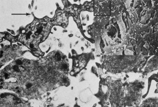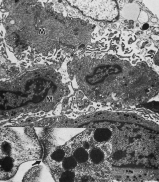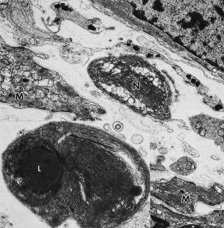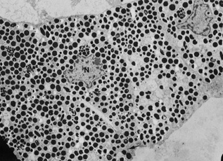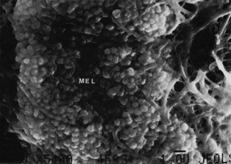 Clump cells of Koganei are most commonly found just anterior to the pupillary sphincter muscle and in the anterior ciliary body near the iris root, although these cells can be seen elsewhere in the iris stroma. These cells can vary in size (up to 100 microns) and appear as heavily pigmented, round cells on light microscopic examination. It is now generally accepted that the term “clump cell” actually includes two distinct populations of cells distinguished by their microscopic features.7,32,33 Type I clump cells are the predominant cell type seen and are probably macrophages. Transmission electron microscopic examination reveals that the type I clump cells have delicate villi projecting from their surface and that their cytoplasm is densely filled with clusters of melanin granules of varying sizes and shapes (Fig. 14). The nucleus is often eccentrically located, and the cells typically contain round or irregular bodies that are thought to contain either lipid or lipofuscin. These cells have no basement membrane. Type I clump cells are difficult to find in the irides of children, and increase in number with patient age. Like macrophages, the proposed function of Type I clump cells is to ingest released melanin from pigment released from dying cells. Type II clump cells are less common and are thought to represent smooth muscle cells in arrested stages of development. Light microscopic examination shows that type II clump cells have a more regular outline with more homogenously distributed pigment granules than type I clump cells. Transmission electron microscopy examination shows that type II clump cells are a group of cells that contain pigment granules identical to those found in the iris pigment epithelium. These cells may form clusters surrounded by a continuous basement membrane and are bordered by apical villi that extended into cleftlike spaces. These cells are attached to each other by desmosomes and contain intracytoplasmic filaments and micropinocytic vesicles.33