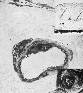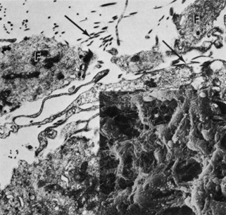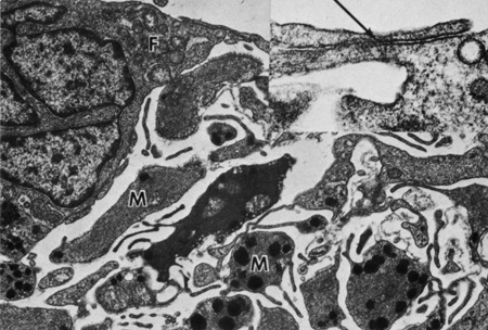 Fibroblasts are prominent on the iris surface. Transmission electron microscopic examination of these fibroblasts reveals abundant mitochondria, rough endoplasmic reticula, free ribosomes, and bundles of filaments (Fig. 9). Some fibroblasts have basal bodies in their cytoplasm, with associated cilia projecting into the anterior chamber (Figs. 10 and 11). Melanocytes are most often found just beneath fibroblasts and contain mitochondria, smooth and rough endoplasmic reticula, free ribosomes, and melanin granules in various stages of development (Fig. 12). The blood vessels and nerve fibers of the anterior border layer are similar to those in the deeper stroma and are discussed later.29 |
