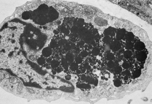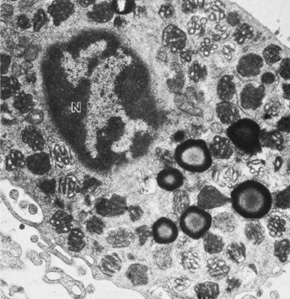 Iris macrophages resemble type I clump cells, differing only in their more elongated shape and in the contents of their residual bodies, which may contain substances other than melanin. Two types of mast cells are observed in the iris stroma and may represent different stages of development or activity. These mast cells are rounded cells, with oval nuclei, and have two types of inclusions within the cell. One type contains rod-shaped granules with a characteristic scrolllike cross-sectional appearance (Fig. 15), the other mast-cell type contains membrane-bound vesicles filled with an amorphous electron-dense appearance.
