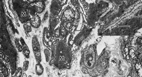 a possibility that the iris muscles may be of neural crest origin.6 The iris sphincter muscle is located in the pupillary portion of the iris stroma. It measures 0.75 to 1 mm in diameter and 0.1 to 1.7 mm in thickness (making it considerably thicker than the dilator muscle). Light microscopic examination shows that the sphincter muscle is composed of spindle-shaped cells that are oriented parallel to the pupillary margin, such that when the muscle contracts, the pupil constricts. These cells are arranged in bundles separated by collagenous septae. Melanocytes are also found in association with muscle bundles. The sphincter muscle is surrounded posteriorly by a layer of dense connective tissue that separates it from the dilator muscle and the pigment epithlium. Several pigmented projections, or spurs, extend from the dilator muscle toward the sphincter muscle in the adult iris. These spurs are known as Fuchs' spurs in the region posterior to the iris muscle, Michel's spurs at the peripheral edge of the sphincter muscle, and Grunert's spurs at the iris root. Electron microscopic features of iris sphincter muscle cells show that they are arranged in bundles of five to eight cells that are connected to each other by tight junctions. Cell nuclei are centrally located and are surrounded by cytoplasmic organelles, which include centrioles, mitochondria, rough endoplasmic reticulum, free ribosomes, and a Golgi apparatus. The sphincter muscle also contains aggregates of myofilaments and pinocytic vesicles, the latter located peripherally in the muscle cells (Fig. 18). The muscle cells are surrounded by a basement membrane. A small bundle of nerve axons surrounded by a Schwann cell may come to within 0.1 microns of the muscle bundles. Occasional naked axons are seen terminating near a sphincter muscle |