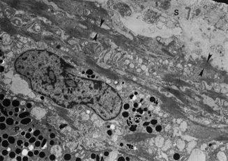 and is due to their common embryologic precursor, the optic cup. The muscular portion of the cell measures about 4 microns in thickness. The muscular extensions of the cells are oriented toward the pupil, arranged in an overlapping manner such that, when the muscle contracts, the pupil dilates. The nucleus of these cells is located in the epithelial apical portion. Ultrastructural features of the muscular portion of these cells include ribbonlike muscular processes surrounded by a basement membrane that terminates at the epithelial apical portion of the cell (Fig. 19). The muscle cells are joined by tight junctions. The cytoplasm of the muscular portion of the cell contains myofilaments, mitochondria, and densities resembling the Z-discs of skeletal muscle. Rare pigment granules and pinocytic vesicles may be seen. Unmyelinated nerve endings may be found in the muscle processes. The epithelial apical portion of the cells is similar to the posterior pigment epithelium. The apical surfaces of the anterior and posterior pigment epithelium are separated by intercellular spaces containing numerous microvillous processes projecting from the two cell layers. The layers are joined to each other by tight intercellular junctions and desmosomes. The basement membrane of the muscular portion of the anterior iris epithelium is not present surrounding the epithelial apical portion of the cell. Mitochondria, pigment granules, rough endoplasmic reticulum, free ribosomes, smooth endoplasmic reticulum, a Golgi apparatus, and the cell nucleus are identified by electron microscopic examination within this posterior, epithelial apical portion of the cell. Interestingly, recent studies have examined the cellular functions of the iris pigment epithelial (IPE) cells and suggest that they may undergo de-differentiation when transplanted into certain cellular environments, expressing the phenotypic characteristics of cells in other ocular tissues. These observations have led investigators to consider IPE cells as an autologous source of cells used for transplantation into injured or degenerating tissues of the eye. Furthermore, IPE cells have also been promoted as cellular vectors to deliver therapeutic genes to injured tissues of the eye.35 |