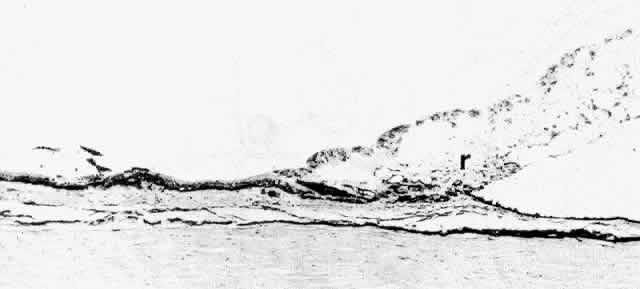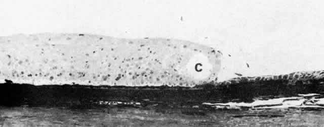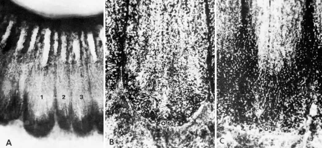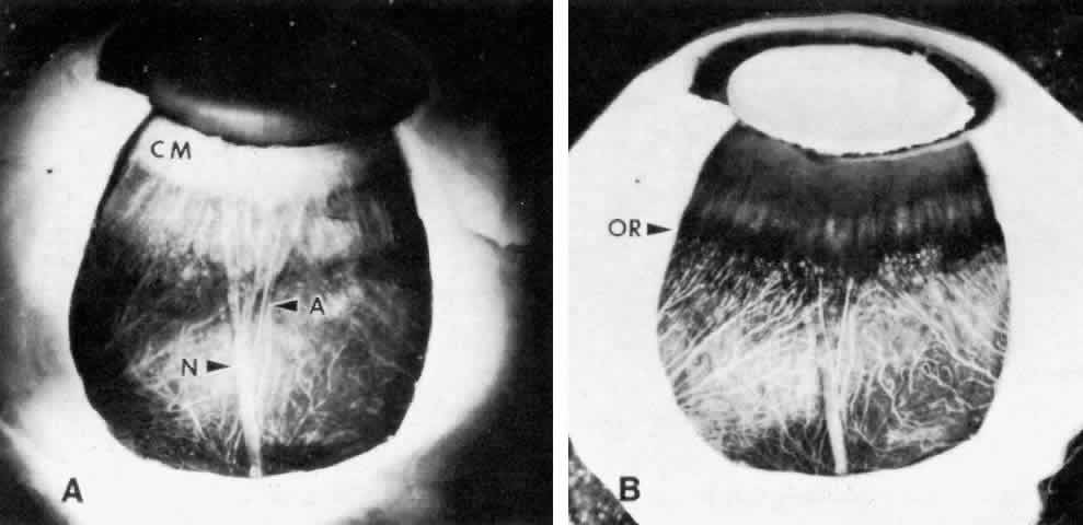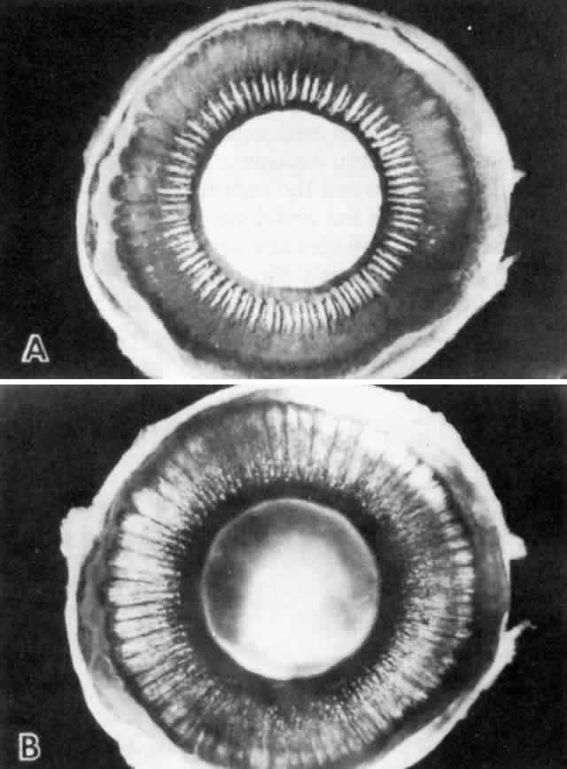 in the nasal horizontal meridian. The ciliary processes continue to enlarge and become more convoluted in adult life, gradually losing superficial pigment so that their crests are whitened (see Fig. 1A). A marked knobby or warty change develops on their surfaces and in the valleys between them in old age (Fig. 6C and D). In the infant, the fine zonular fibers are draped over the rudimentary ciliary process region like a smooth, silvery membrane (see Fig. 6A). As the processes elevate and become more complex, they divide the zonules into separate aggregates of fibers, with fewer passing over the heads of the processes. The anterior beaklike ends of the processes are always free of zonular fibers and their attachments. |