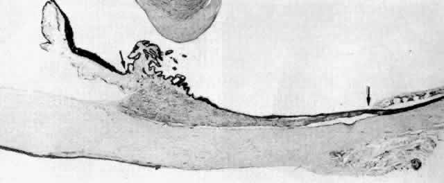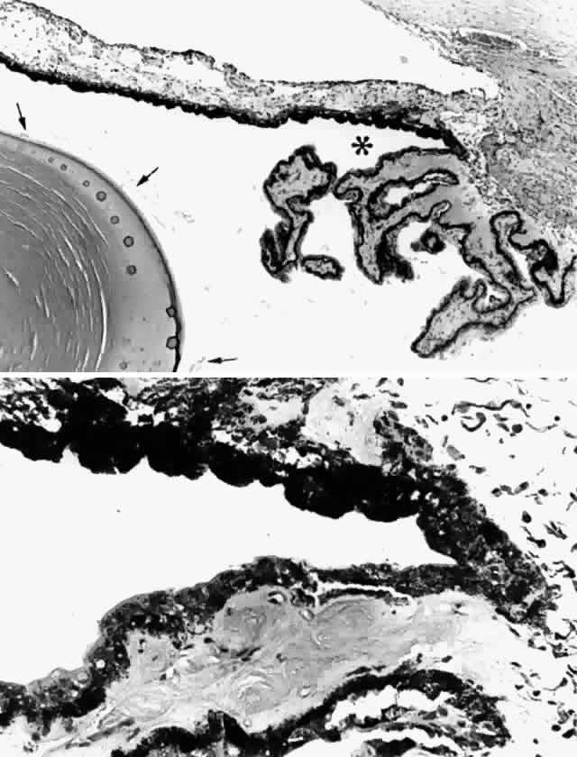 would be of interest for transscleral suture fixation of haptics. The irregular contour of the sulcus area has been well described, particularly narrowing of the sulcus caused by occasional bands and folds extending from the ciliary processes onto the back of the iris.10 These extensions probably derive from the incomplete migration of ciliary processes off the peripheral iris, as previously mentioned,8 and could misdirect haptics into the easily penetrated iris or ciliary body during IOL insertion (Fig. 7B). This information has led to recommendations for smaller total IOL diameters in posteriorly fixated lenses,11 which should help avoid haptic puncture or erosion into the uvea and possible vascular occlusions.8,12 |
