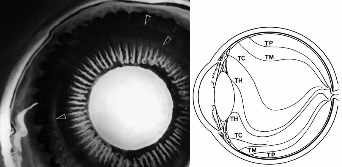 The two layers of ciliary epithelium are firmly adherent to each other and to their underlying stroma at the ora serrata, where the nonpigmented layer is suddenly converted into retina. The more loosely attached retina and any retinal teeth are easily stripped from this firm junction by gentle traction on the vitreous, creating the sharply demarcated retinal edge seen in traumatic disinsertion of the retina. The dense attachment of vitreous known as the vitreous “base” extends from the peripheral retina up onto the posterior 2 mm of the pars plana, before separating as the anterior hyaloid membrane. A grayish line frequently appears just behind the anterior limit of attachment (Fig. 10A), visible clinically with a three-mirror lens. This gray line is the edge of one of the prominent vitreous lamellae that develop in adults, separating the vitreous cavity into several anteroposterior compartments. Eisner first described these compartments, referring to them as tracts14 (Fig. 10B). The lamella inserting on the midpars plana was named the median tract. One or more over the ciliary processes constitute the coronary tract, and that at the periphery of the lens is the anterior hyaloid tract. These same regions have prominent circumferentially arranged zonular and vitreous girdle fibers on and within the anterior hyaloid membrane,15 helping to anchor the vitreous to the ciliary body and lens at sites of traction during ocular movement and accommodation. Zonular fibers in the girdle have deeper attachments to the main zonular stream and basement membrane of the inner ciliary epithelium. |