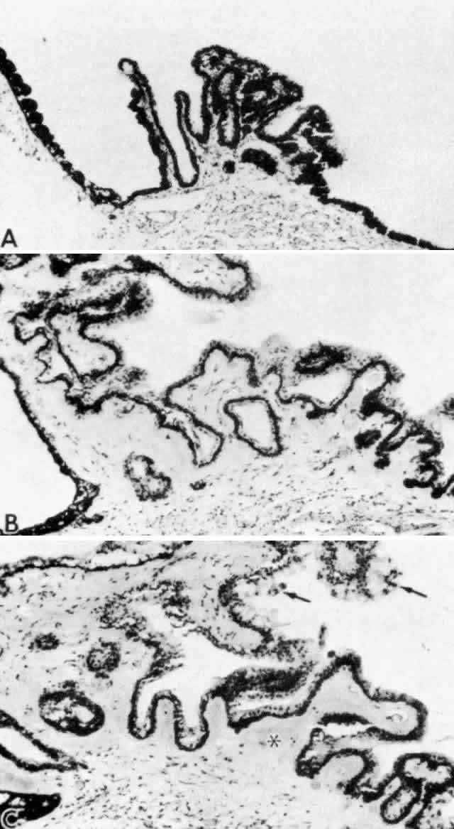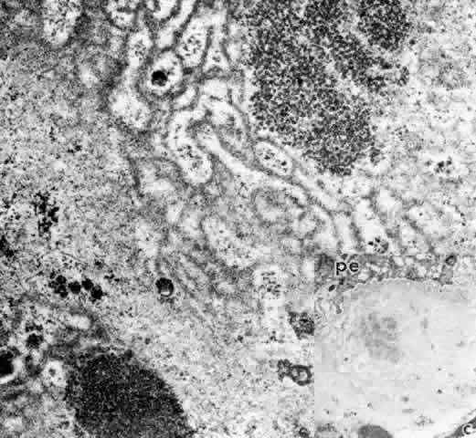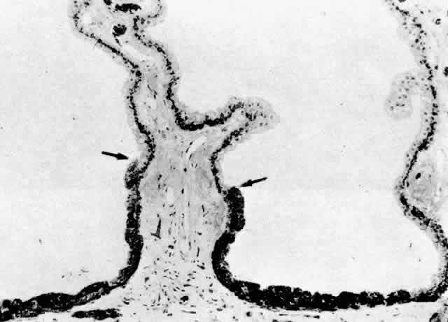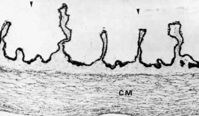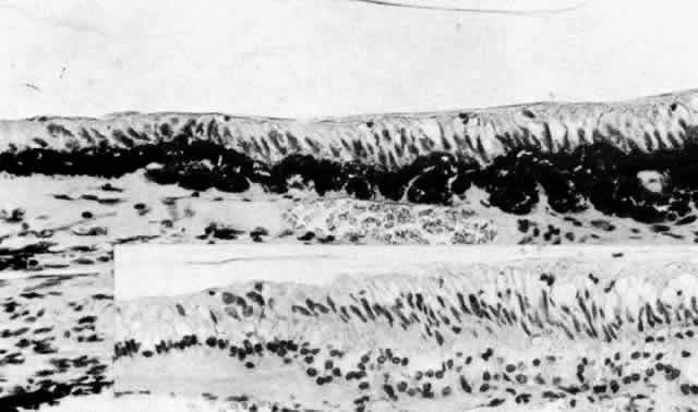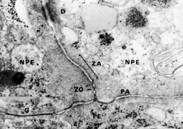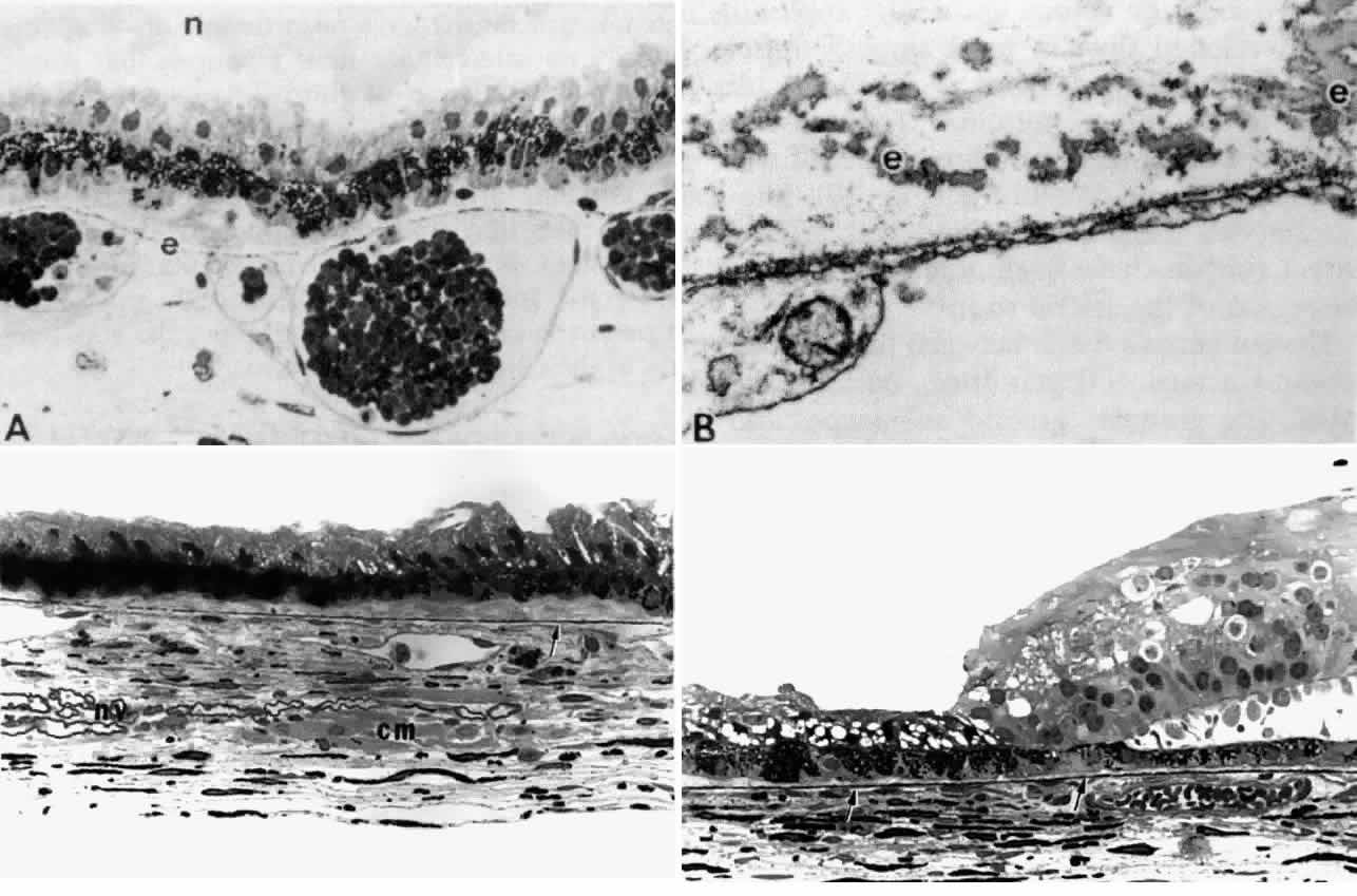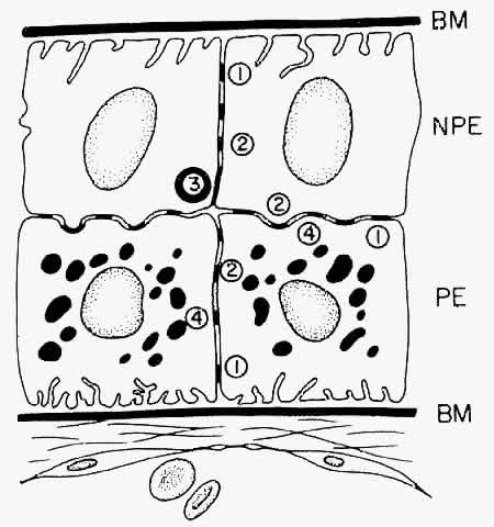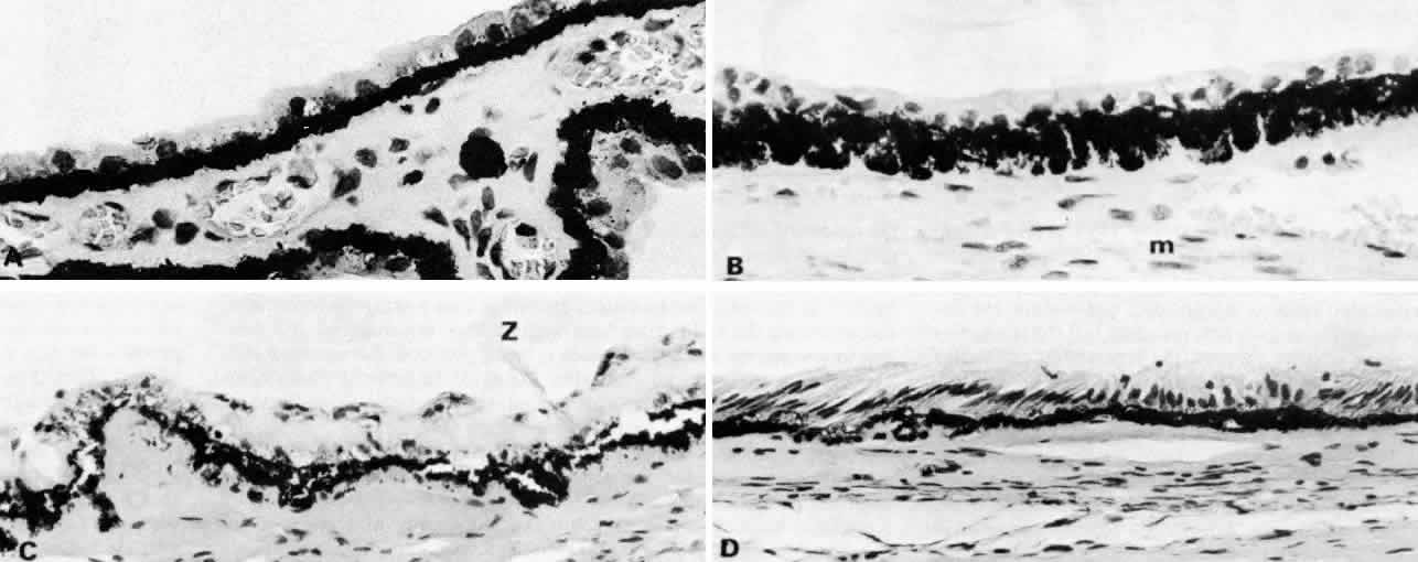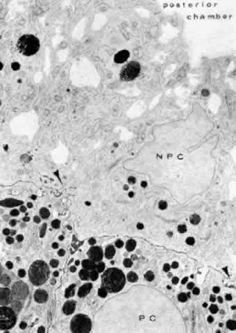NONPIGMENTED CILIARY EPITHELIUM The ciliary epithelium consists of two layers: an inner nonpigmented (NPE) and an outer pigmented layer (PE). These two layers derive from infolding of the single cell layer of the optic vesicle against itself, to form the optic cup. The potential space left between the two ciliary layers rarely opens, owing to the frequency of junctional complexes uniting the cells. A peculiar result of the infolding affects nomenclature in this region, since the apices of the epithelial cells now face each other across the potential space (Fig. 11). The bases of the cells face outward, toward the ciliary body stroma for the PE, and toward the posterior chamber for the NPE. Basement membrane covers the bases of both cell layers as is characteristic of epithelial cells. The NPE of the ciliary body stretches in a continuous layer from the root of the iris to the ora serrata. As the transition from pigmented iris epithelium occurs, melanin granules in the inner layer suddenly decrease in number, and the cells become slightly smaller (Fig. 12). In the pars plicata the NPE cells are cuboidal, 12 to 15 μm in width, with central nuclei (Figs. 13A and 13B). The knobbiness that develops during aging is due to small nodular proliferations of NPE cells, especially on the minor plicae (Fig. 13C). In the young eye the cells of the pars plana are also cuboidal, but with growth they become thinner and more columnar, sometimes reaching up to 30 μm in height and 5 to 10 μm in width (Fig. 13D). In the posterior half of the pars plana, some NPE cells tilt forward as though responding to anterior zonular traction, while others may be inclined posteriorly, suggesting complex vectors of force in this region. The nuclei are vertically oval and lie near the apex of the cells. The epithelium here becomes very irregular with aging, showing hyperplastic toothlike cell processes intertwining and extending up into the vitreous and among the zonular fibers. At the ora serrata the ciliary NPE joins the retina abruptly, highlighting the difference in thickness of these two layers (Fig. 14).