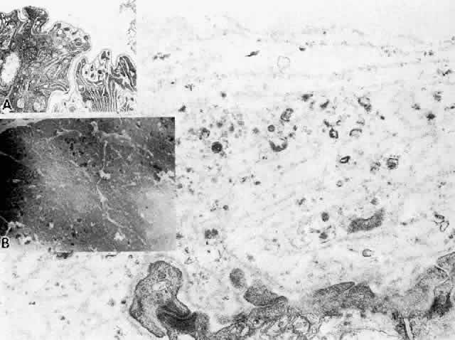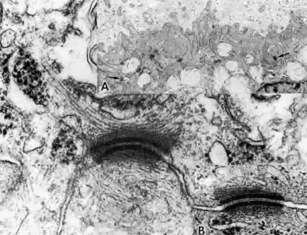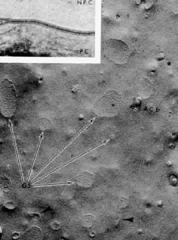 While the ultrastructure of the PE is similar in most areas of the ciliary body, that of the NPE shows noticeable regional differences that appear to be of functional importance. These differences have been studied more extensively in the monkey than in the human but are similar in both species.2,16–26 The pars plicata, and particularly its anterior portion, appears to be the predominant site of aqueous formation and has many special characteristics of this secretory function. The NPE here has marked cytoplasmic infolding at its base and redundant interdigitations at its basolateral margins, greatly increasing the area of the cell surface facing the posterior chamber (Fig. 15, Inset A). These cell membranes and, to a lesser degree, those of the pigmented epithelium contain the enzyme complex Na+ /K+ -ATPase, evidence of anenergy-dependent active transport system.27 The presence of the enzyme carbonic anhydrase in the NPE cells of the pars plicata of all species studied is further evidence of fluid-pumping activity.28 In the moderately electron-lucent cytoplasm of the anterior NPE particularly, there are large numbers of mitochondria near the base of the cell and rough endoplasmic reticulum (RER) in single cisternae or parallel stacks near the nucleus, where Golgi complexes are also common22 (Fig. 16). The mitochondria are of importance in providing energy for transport, and the RER for processing of new protein. Clusters of free ribosomes and occasional cilia are found in all areas. With aging, unusual whorled formations of RER are described near the cell base in the pars plicata, along with lipid droplets and lysosomal residual bodies.17,22 In the child's eye, the basement membrane is a simple thin layer over the base of the NPE cells, not extending into the surface or lateral infoldings (Fig. 17, Inset A). As is typical for thin basement membranes, it is a 30-nm granular layer separated from the plasmalemma by a 50-nm lucent zone. Beginning in the first decade, the basement membrane undergoes a remarkable thickening of the multilaminar reticulated type. This change has been identified by the age of 3 years,17 beginning in the valleys of the posterior half of the pars plicata. From this region, the thickening by multiple intertwining thin layers of reticular basement membrane extends posteriorly and up onto the lateral walls of the ciliary processes, involving almost all of the ciliary epithelium in those over the age of 50 years. This thick basement membrane may reach 2 μm with an increasing quantity of membrane-bound vesicles and granular material, apparently debris of cellular metabolism (see Fig. 17). Seen from the inner surface, the basement membrane has a fibrogranular texture resembling the loose superficial lens capsule in the zonula lamellar region (Fig. 17, Inset B). Zonular bundles are seen in close apposition to the basement membrane and pass superficially within it in the ciliary valleys, to which they have a very firm attachment.15 In the pars plana, the tall NPE cells have numerous intermediate filaments and granules that give the cells a more electron-dense appearance than anteriorly (Fig. 18A) and are profusely supplied with tubules of smooth-surfaced endoplasmic reticulum (Fig. 18B). The intermediate filaments in the NPE of the pars plicata over the ciliary crests and in the pars plana are strongly immunoreactive for vimentin, with fainter staining for cytokeratin 18, just the reverse of the staining pattern in the ciliary PE.26 The vimentin-positive intermediate fibers attach the cytoskeleton to adherens junctions and often indicate cells subject to tractional or cell-shape stresses. Fine actin filaments are present in the cytoskeleton of both epithelial cell types, without regional differences. Extensive cystic dilatations of the intercellular spaces between the NPE cells commonly occur in the posterior pars plana of adult eyes. Fine and Zimmerman2 showed that these spaces contain hyaluronidase-sensitive acid mucopolysaccharide and suggested it might be hyaluronic acid intended for the vitreous. An increased number of Golgi complexes in this region also suggests production of some glycoprotein.22 Immunostaining for the membrane-bound enzyme hyaluronan synthase is positive on the membranes of the primate posterior pars plana NPE cells and hyalocytes, consistent with local hyaluronan secretion.3 Interestingly, staining is equally intense over the crests of the ciliary processes. There are a large number of intercellular junctions between the ciliary epithelial cells, each giving important data about the specific functions of these cells (see Fig. 11). Toward the base of the NPE cells their lateral sides are joined by desmosomes (see Fig. 15). At their apical ends they are connected by typical tight junctional complexes consisting of a zonula occludens and zonula adherens (Fig. 19). These tight junctions represent the primary blood-aqueous barrier in the ciliary body. When large tracer molecules such as horseradish peroxidase are injected intravenously into primates,20,21 the tracer has an easy passage through the fenestrated capillaries of the ciliary processes, but does not pass beyond the apices of the NPE cells (see Fig. 19). The zonula occludens is the primary component of the blood-aqueous barrier “tight junction.” It appears as a focal area at which the bilayered plasmalemmal membranes of each cell surface are tightly joined (Fig. 20). Zonular adherens junctions occur adjacent to occludens junctions on the basal side. They show a 12- to 15-nm space between the adjoining cells, with filamentous matrix material clinging to the cell membranes on either side. By the freeze-fracture technique, the zonula occludens consists of branching anastomosing strands on the cytoplasmic side of the plasmalemmal membrane (P-face) and matching grooves on the external side (E-face), giving a quilted effect (Fig. 21). The variation in number of strands seen from area to area i
