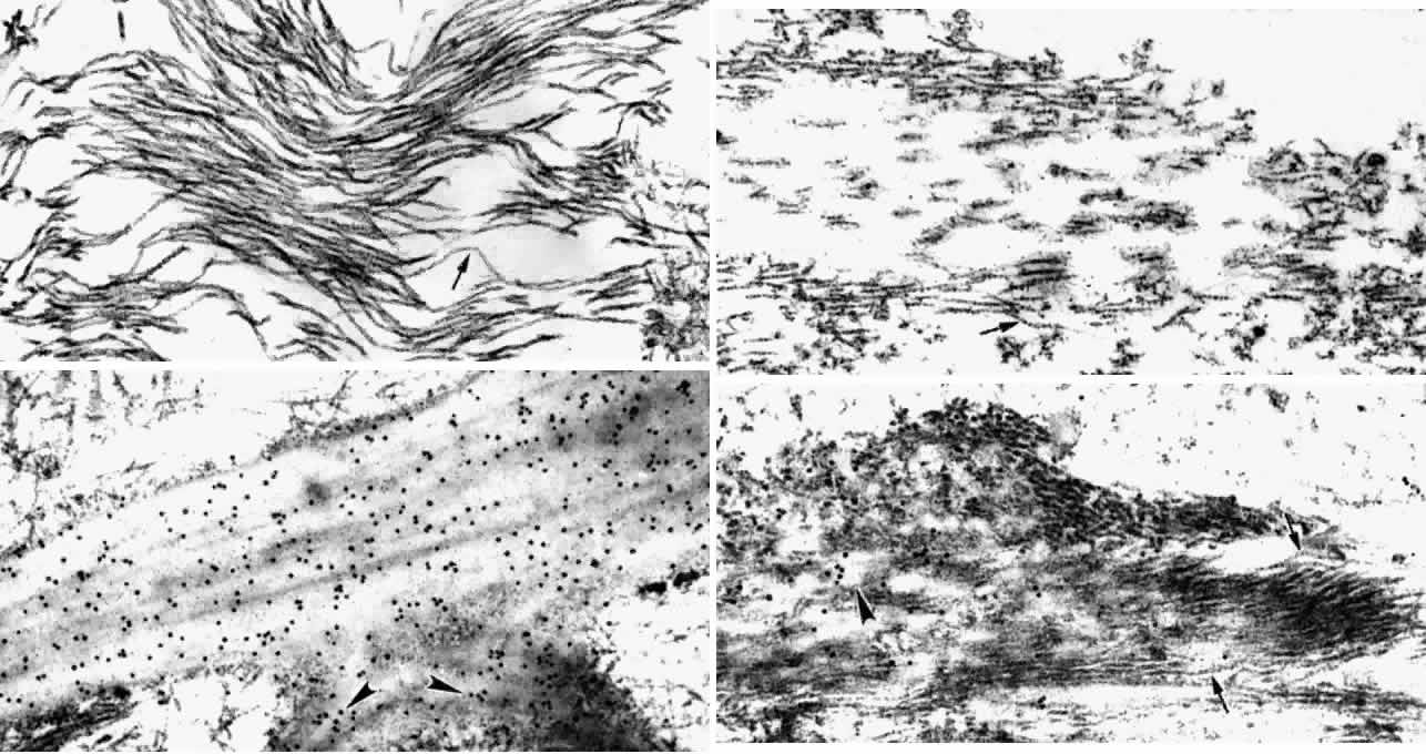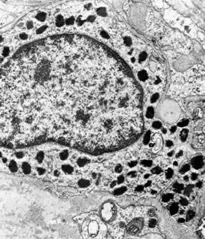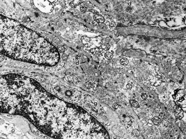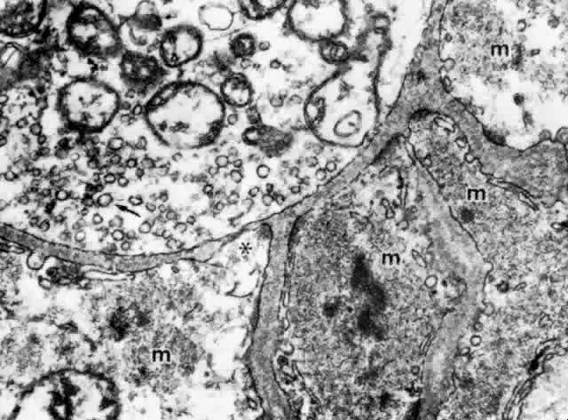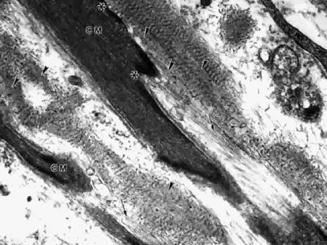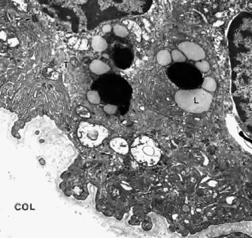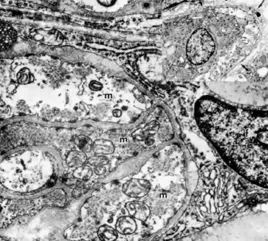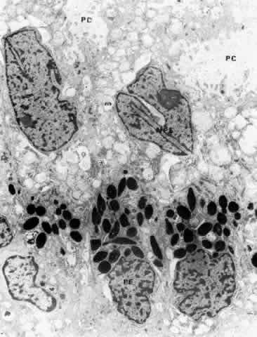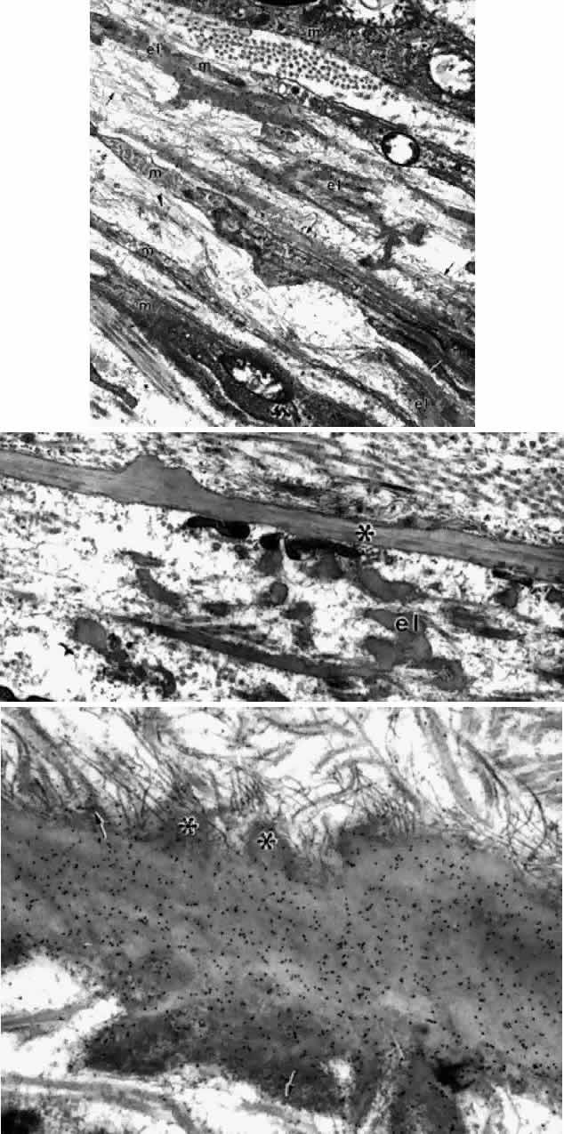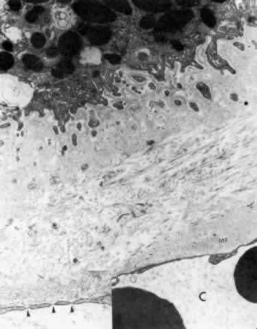 PIGMENTED CILIARY EPITHELIUM The ciliary PE is in most regions a single layer from the ora serrata to the iris. The cells have a similar cuboidal shape in all parts of the ciliary body, from 10 to 12 μm in height and about 10 μm in width.4 Scattered irregularly through the pars plicata region and more regularly in the pars plana are small nodules of PE cells protruding more deeply into the stroma. These nodules of cells have small round nuclei and no lumina, thus not appearing to be glandular in nature (Fig. 24). It is suggested they may provide a stronger anchorage against tractional stresses in these regions.30 The lateral margins of the PE cells are straight, with the same junctions seen between NPE and PE cells, that is, gap junctions, desmosomes, and puncta adherentes.22,23 No zonula occludens is found, so this layer has no barrier function. However, in the most posterior pars plana adjacent to the retina, the PE cells appear to contain both carbonic anhydrase and Na+ /K+ -ATPase.27,28 Flugel and Lutgen-Drecoll28 suggest this stronger pump could prevent retinal edema in the region where the tight junction site switches from the apical NPE of the ciliary body to the apical PE of the retina. The cytoplasm of the PE cell is more electron-dense than that of the NPE cell, containing many free ribosomes, actin filaments, and predominantly cytokeratin-containing intermediate filaments (Fig. 25).26 The mitochondria are smaller and fewer in number than in the NPE, as is the RER, and the Golgi apparatus is present irregularly. There are large numbers of rounded and some elliptical melanin pigment granules of the 0.8 μm to 2 μm size characteristic of neuroepithelium, and three to four times larger than those of the stromal pigment cells. A decrease in pigment granules occurs in the PE over the crests of the ciliary processes from the fourth decade of life. Lipid droplets and complex lipopigment granules are seen within the cytoplasm during aging (see Fig. 25). The base of the PE cell is markedly infolded, lying on a basement membrane that with aging develops a thick, multilaminar pattern generally denser than that over the NPE cells but also containing vesicular, fibrillar, and granular inclusions (Fig. 26). The basement membrane of the PE is often very close to or almost continuous with that of the fenestrated capillaries in the pars plicata region (Fig. 27). CILIARY BODY STROMA The stroma of the ciliary body contains all the usual components of extracellular matrix including collagens, elastic system fibers, and small matrix molecules such as proteoglycans. The cellular components are melanocytes, fibroblasts, blood vessels, and nerves, besides the large quantity of smooth muscle comprising the bulk of this tissue. In the first one and one-half decades the nonvascular connective tissue in the ciliary processes is scanty, resulting in the thin, underdeveloped appearance of the juvenile ciliary processes (Fig. 28A). Their vessels are primarily fenestrated capillaries and veins, forming plexi (see later section on blood supply). The subepithelial tissue in the processes and plicae becomes very much thickened by collagenous and hyaline material with aging (Fig. 28B and C), extending down to the ciliary muscle itself. In the deeper stroma, capillaries are usually not fenestrated and show intermittent pericytes outside the endothelial cell layer, surrounded by basement membrane that merges with that of the endothelial cells (Fig. 29). The ciliary processes are essentially vascular structures and do not contain extensions of the ciliary muscle, so the muscle has the same thickness under the processes as under the ciliary valleys (Fig. 30). The choriocapillaris does not continue forward into the ciliary body from the choroid, but a thin layer of elastica continuous with Bruch's membrane does (Fig. 31D). In the ciliary body, the elastica quickly becomes separated from the basement membrane of the ciliary PE by the interposition of a dense and then looser connective tissue (Fig. 31C). The elastic layer remains close to the underlying thin-walled pars plana veins (Fig. 31A), becoming increasingly discontinuous (Fig. 31B) with wider branching, and is finally lost under the pars plicata. Elastic fibers are composed of two major components, the 10- to 12-nm elastic system microfibrilswith 12-nm microperiodicity, and the homogeneous electron-lucent core of elastin. The elastic microfibril is tubular in cross section, beaded on rotary shadowing, and belongs to the same family as the zonular fibril.31,32 When aggregated together without elastin, these microfibrils are called oxytalan fibers (Fig. 32A). Elastin molecules are laid down on this microfibrillar template during elastogenesis (Fig. 32B), completely obscuring the microfibrillar substructure in mature elastic fibers (Fig. 32C). Nonelasticized oxytalan fibers are ubiquitous throughout most connective tissues and are plentiful throughout the ciliary body. They serve as connecting or anchoring fibers between basement membranes of epithelia, vessels, muscle bundles, and nerves, and link together different portions of the elastic fiber system in the ciliary body33 (see Figs. 27, 29, 33) as in other tissues.34 Incompletely elasticized fibers with many remaining microfibrils (elaunin fibers) are also seen (Fig. 32D).32 Besides the subepithelial elastica continuous with Bruch's membrane, mature elastic fibers are not frequent in the ciliary body except at the muscular insertions (see next section). The interstitial cells of the ciliary stroma are fibroblasts, melanocytes, and scattered mast cells, along with a large number of myelinated and unmyelinated nerves (see Fig. 33). The fibroblasts have scanty cytoplasm, many long, thin processes, and elongated nuclei with finely clumped chromatin. Organelles are rather scanty, with many free ribosomes and cilia. Segments of RER and Golgi apparatus are the primary organelles. The multiprocessed melanocytes are s