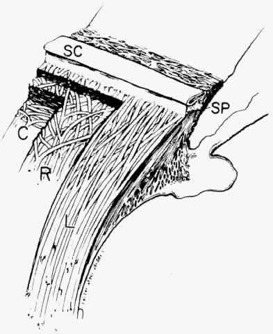 The shape of the ciliary body is triangular in cross section, its short anterior side or “face” forming a 45° to 90° angle with the scleral surface (Fig. 3), depending upon age and accommodative state.6 The anterior face is directly exposed to the aqueous, forming part of the posterior boundary of the anterior chamber. The iris root arises from the midportion of this face. At its anterior end, the ciliary body attaches laterally to the scleral spur, its firmest point of fixation to the globe, and its connective tissue blends into that of the trabecular meshwork. Along the rest of its outer face, the ciliary body has loose attachments to the sclera, readily separating at this level during processing for microscopy. This ciliary-scleral junction is called the supraciliaris or supraciliary lamina. The seven anterior ciliary arteries enter the ciliary body from the rectus muscles through scleral canals just behind the pars plicata. These entry sites are the only other firm attachments of the ciliary body to the outer globe. In 12% of eyes, a large loop of long posterior ciliary nerve enters the sclera from the ciliary body in this region, sometimes in the same canal as an anterior ciliary artery, and is called a nerve loop of Axenfeld7 (Fig. 4). These loops seem to have no purpose and return to continue their anterior course in the ciliary body. They may be visible subconjunctivally 3 to 4 mm from the limbus, especially in the inferior quadrants.7 When associated with melanin pigment, the loop may appear as a pigmented spot under the conjunctiva, requiring differentiation from extraocular extension of a malignant melanoma. Its sensitivity to touch and the absence of a tumor shadow on transillumination aid in this diagnosis. The posterior limit of the ciliary body is sharply demarcated on its inner surface at its abrupt junction with the retina at the ora serrata. No such demarcation occurs on its outer surface where the supraciliaris blends directly into the suprachoroidalis. The inner surface of the ciliary body is in close relation to the zonular fibers, except for the anterior rounded ends of the processes. On its posterior half, this inner surface gives attachment to the anterior two thirds of the vitreous “base,” and its anterior half forms the lateral boundary of the posterior chamber. The lens lies 1 to 1.5 mm centrad to the ciliary processes, depending upon age and lens diameter, as the enlarging lens narrows the perilenticular space. The ciliary body is easily freed from the sclera by a spatula passed through its attachment to the scleral spur, allowing inspection of both supraciliary surfaces. The scleral surface is smooth, slightly pigmented, and marked only by canals for ciliary arteries and nerves. The ciliary surface has loose sheets of pigmented stroma and muscle over its posterior two thirds. On these lie the thin, long ciliary arteries and the flat, ribbonlike long ciliary nerves, both of which may bifurcate at the posterior border of the ciliary body (Fig. 5). The anterior third of this surface is marked by the slightly convex white mass composing the main bulk of the ciliary muscle (see Fig. 5A). |