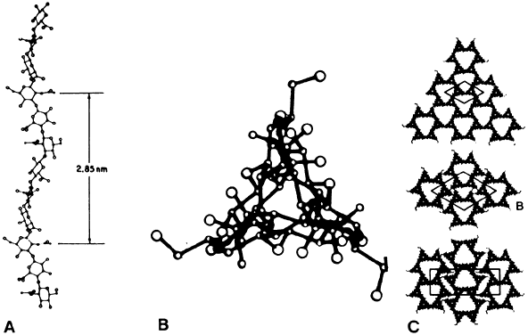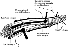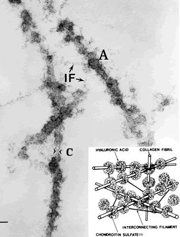 MOLECULAR CONSTITUENTS Collagens Collagen is an important structural protein in vitreous, as in connective tissues everywhere. Gloor17 pointed out that the collagen content is highest where the vitreous is a gel. Gross18 was the first to claim that vitreous collagen fibrils are morphologically distinct from collagen in other connective tissues. Yet, Swann and co-workers19 demonstrated that the amino acid composition of the insoluble residue of vitreous is similar to that of cartilage collagen and later identified that it is most similar to cartilage collagen composed of α1 type II chains.20 Comparisons of the arthritogenic and immunologic properties of collagens from bovine articular cartilage (type II) and vitreous showed that the two were indistinguishable by these assays.21 However, subsequent studies22 demonstrated that while vitreous collagen contains an α1 type II chain similar to cartilage collagen, there is a lower alanine content. Furthermore, these studies found that vitreous collagen has additional peptides present as uncleaved extension chains containing an amino acid composition different from the alpha chain component. The investigators concluded, however, that the overall similarities in amino acid composition and in the types of cyanogen bromide cleavage peptides indicate that the fibers of the central and posterior peripheral regions of the vitreous are composed of a collagen that should be classified as type II. Schmut and associates23 used differential salt precipitation of pepsin-solubilized collagen from bovine vitreous and found that type II collagen is the major component of native vitreous fibers. Linsenmayer and collaborators24 measured in vivo synthesis of types I and II collagen in chick embryo vitreous by radioimmunoprecipitation after tritiated proline labeling and found that over 90% of the labeled material in the vitreous was type II collagen. Snowden25 provided further physicochemical evidence in support of the similarities between vitreous and cartilage collagens. Considered as a whole, this body of work may explain why certain clinical phenomena, such as inborn errors of type II collagen metabolism in arthro-ophthalmopathies, manifest phenotypic expression in each of these two tissues. There are, however, distinct differences in the chemical composition of vitreous and cartilage collagens that are only partly due to the presence of terminal peptide constituents in vitreous collagen. Swann and Sotman26 have demonstrated that the carbohydrate content of pepsin-solubilized vitreous α chains is significantly greater than cartilage α chains, indicating that the carbohydrate side chains of vitreous collagen are largely composed of disaccharide units similar to those found in basement membrane collagen. They proposed that these distinct chemical features are related to the special structure of the mature vitreous fibrils in vivo. Liang and Chakrabarti27 have shown that there are differences between bovine cartilage and vitreous with respect to collagen fibril growth, melting temperature, and fluorescence with a hydrophobic fluorescent probe. These investigators and others28 proposed that vitreous collagen should be considered a special type II collagen. Ayad and Weiss29 demonstrated that type II is the major vitreous collagen in bovine vitreous but collagens composed of α1, α2, and α3 chains as well as C-PS disulfide-bonded collagen were present in concentrations similar to those in cartilage. In contrast to cartilage, however, vitreous type II collagen was significantly more hydroxylated in the lysine and proline residues. The α1, α2, and α3 collagen chains were interpreted by Van der Rest30 to represent type IX collagen. Eyre and colleagues31 felt that there was evidence to indicate the presence of type V collagen in vitreous. Furthermore, with respect to the disulfide-bonded collagen, vitreous had three times more C-PS1 and C-PS2 collagens than cartilage although the molar ratio of C-PS1 to C-PS2 in both was 1:1, suggesting that in both tissues these collagens are components of a larger molecule, possibly a derivative of type IX collagen. In this regard vitreous is once again similar to cartilage, insofar as both contain type IX collagen, although the two tissues differ in the sizes of type IX collagen chains.32 Hong and Davison33 have identified a procollagen in the soluble fraction of rabbit vitreous that was identified as type II by segment-long spacing-banding patterns. Detection of a propeptide extension only at the N-terminus prompted these investigators to conclude that this was a novel type II procollagen. Such distinctive characteristics are possibly related to the unique physiologic roles of vitreous, in particular, its mechanical function.12 Vitreous collagen fibrils are organized as a triple helix of three alpha chains (Fig. 2). The collagen fibrils of vitreous are heterotypic, consisting of more than one collagen type. Recent studies of pepsinized forms of collagen confirm that vitreous contains collagen type II, a hybrid of types V/XI, and type IX 34,35